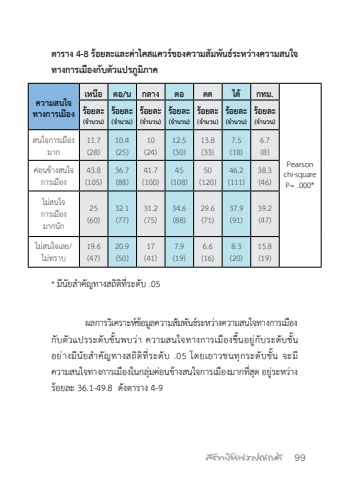 99%u0e15%u0e32%u0e23%u0e32%u0e07 4-8 %u0e23%u0e49%u0e2d%u0e22%u0e25%u0e30%u0e41%u0e25%u0e30%u0e04%u0e48%u0e32%u0e44%u0e04%u0e2a%u0e41%u0e04%u0e27%u0e23%u0e4c%u0e02%u0e2d%u0e07%u0e04%u0e27%u0e32%u0e21%u0e2a%u0e31%u0e21%u0e1e%u0e31%u0e19%u0e18%u0e4c%u0e23%u0e30%u0e2b%u0e27%u0e48%u0e32%u0e07%u0e04%u0e27%u0e32%u0e21%u0e2a%u0e19%u0e43%u0e08%u0e17%u0e32%u0e07%u0e01%u0e32%u0e23%u0e40%u0e21%u0e37%u0e2d%u0e07%u0e01%u0e31%u0e1a%u0e15%u0e31%u0e27%u0e41%u0e1b%u0e23%u0e20%u0e39%u0e21%u0e34%u0e20%u0e32%u0e04%u0e04%u0e27%u0e32%u0e21%u0e2a%u0e19%u0e43%u0e08%u0e17%u0e32%u0e07%u0e01%u0e32%u0e23%u0e40%u0e21%u0e37%u0e2d%u0e07%u0e40%u0e2b%u0e19%u0e37%u0e2d %u0e15%u0e2d/%u0e19 %u0e01%u0e25%u0e32%u0e07 %u0e15%u0e2d %u0e15%u0e15 %u0e43%u0e15%u0e49 %u0e01%u0e17%u0e21.Pearson chi-squareP= .000*%u0e23%u0e49%u0e2d%u0e22%u0e25%u0e30(%u0e08%ufffd%u0e33%u0e19%u0e27%u0e19)%u0e23%u0e49%u0e2d%u0e22%u0e25%u0e30(%u0e08%ufffd%u0e33%u0e19%u0e27%u0e19)%u0e23%u0e49%u0e2d%u0e22%u0e25%u0e30(%u0e08%ufffd%u0e33%u0e19%u0e27%u0e19)%u0e23%u0e49%u0e2d%u0e22%u0e25%u0e30(%u0e08%ufffd%u0e33%u0e19%u0e27%u0e19)%u0e23%u0e49%u0e2d%u0e22%u0e25%u0e30(%u0e08%ufffd%u0e33%u0e19%u0e27%u0e19)%u0e23%u0e49%u0e2d%u0e22%u0e25%u0e30(%u0e08%ufffd%u0e33%u0e19%u0e27%u0e19)%u0e23%u0e49%u0e2d%u0e22%u0e25%u0e30(%u0e08%ufffd%u0e33%u0e19%u0e27%u0e19)%u0e2a%u0e19%u0e43%u0e08%u0e01%u0e32%u0e23%u0e40%u0e21%u0e37%u0e2d%u0e07%u0e21%u0e32%u0e0111.7(28)10.4(25)10(24)12.5(30)13.8(33)7.5(18)6.7(8)%u0e04%u0e48%u0e2d%u0e19%u0e02%u0e49%u0e32%u0e07%u0e2a%u0e19%u0e43%u0e08%u0e01%u0e32%u0e23%u0e40%u0e21%u0e37%u0e2d%u0e0743.8(105)36.7(88)41.7(100)45(108)50(120)46.2(111)38.3(46)%u0e44%u0e21%u0e48%u0e2a%u0e19%u0e43%u0e08%u0e01%u0e32%u0e23%u0e40%u0e21%u0e37%u0e2d%u0e07%u0e21%u0e32%u0e01%u0e19%u0e31%u0e0125(60)32.1(77)31.2(75)34.6(88)29.6(71)37.9(91)39.2(47)%u0e44%u0e21%u0e48%u0e2a%u0e19%u0e43%u0e08%u0e40%u0e25%u0e22/%u0e44%u0e21%u0e48%u0e17%u0e23%u0e32%u0e1a19.6(47)20.9(50)17(41)7.9(19)6.6(16)8.3(20)15.8(19)* %u0e21%u0e35%u0e19%u0e31%u0e22%u0e2a%ufffd%u0e33%u0e04%u0e31%u0e0d%u0e17%u0e32%u0e07%u0e2a%u0e16%u0e34%u0e15%u0e34%u0e17%u0e35%u0e48%u0e23%u0e30%u0e14%u0e31%u0e1a .05%u0e1c%u0e25%u0e01%u0e32%u0e23%u0e27%u0e34%u0e40%u0e04%u0e23%u0e32%u0e30%u0e2b%u0e4c%u0e02%u0e49%u0e2d%u0e21%u0e39%u0e25%u0e04%u0e27%u0e32%u0e21%u0e2a%u0e31%u0e21%u0e1e%u0e31%u0e19%u0e18%u0e4c%u0e23%u0e30%u0e2b%u0e27%u0e48%u0e32%u0e07%u0e04%u0e27%u0e32%u0e21%u0e2a%u0e19%u0e43%u0e08%u0e17%u0e32%u0e07%u0e01%u0e32%u0e23%u0e40%u0e21%u0e37%u0e2d%u0e07%u0e01%u0e31%u0e1a%u0e15%u0e31%u0e27%u0e41%u0e1b%u0e23%u0e23%u0e30%u0e14%u0e31%u0e1a%u0e0a%u0e31%u0e49%u0e19%u0e1e%u0e1a%u0e27%u0e48%u0e32 %u0e04%u0e27%u0e32%u0e21%u0e2a%u0e19%u0e43%u0e08%u0e17%u0e32%u0e07%u0e01%u0e32%u0e23%u0e40%u0e21%u0e37%u0e2d%u0e07%u0e02%u0e36%u0e49%u0e19%u0e2d%u0e22%u0e39%u0e48%u0e01%u0e31%u0e1a%u0e23%u0e30%u0e14%u0e31%u0e1a%u0e0a%u0e31%u0e49%u0e19 %u0e2d%u0e22%u0e48%u0e32%u0e07%u0e21%u0e35%u0e19%u0e31%u0e22%u0e2a%ufffd%u0e33%u0e04%u0e31%u0e0d%u0e17%u0e32%u0e07%u0e2a%u0e16%u0e34%u0e15%u0e34%u0e17%u0e35%u0e48%u0e23%u0e30%u0e14%u0e31%u0e1a .05 %u0e42%u0e14%u0e22%u0e40%u0e22%u0e32%u0e27%u0e0a%u0e19%u0e17%u0e38%u0e01%u0e23%u0e30%u0e14%u0e31%u0e1a%u0e0a%u0e31%u0e49%u0e19 %u0e08%u0e30%u0e21%u0e35%u0e04%u0e27%u0e32%u0e21%u0e2a%u0e19%u0e43%u0e08%u0e17%u0e32%u0e07%u0e01%u0e32%u0e23%u0e40%u0e21%u0e37%u0e2d%u0e07%u0e43%u0e19%u0e01%u0e25%u0e38%u0e48%u0e21%u0e04%u0e48%u0e2d%u0e19%u0e02%u0e49%u0e32%u0e07%u0e2a%u0e19%u0e43%u0e08%u0e01%u0e32%u0e23%u0e40%u0e21%u0e37%u0e2d%u0e07%u0e21%u0e32%u0e01%u0e17%u0e35%u0e48%u0e2a%u0e38%u0e14 %u0e2d%u0e22%u0e39%u0e48%u0e23%u0e30%u0e2b%u0e27%u0e48%u0e32%u0e07%u0e23%u0e49%u0e2d%u0e22%u0e25%u0e30 36.1-49.8 %u0e14%u0e31%u0e07%u0e15%u0e32%u0e23%u0e32%u0e07 4-9