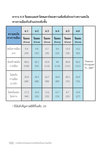 100 %u0e01%u0e32%u0e23%u0e28%u0e36%u0e01%u0e29%u0e32%u0e04%u0e48%u0e32%u0e19%u0e34%u0e22%u0e21%u0e1b%u0e23%u0e30%u0e0a%u0e32%u0e18%u0e34%u0e1b%u0e44%u0e15%u0e22%u0e43%u0e19%u0e40%u0e22%u0e32%u0e27%u0e0a%u0e19%u0e44%u0e17%u0e22%u0e15%u0e32%u0e23%u0e32%u0e07 4-9 %u0e23%u0e49%u0e2d%u0e22%u0e25%u0e30%u0e41%u0e25%u0e30%u0e04%u0e48%u0e32%u0e44%u0e04%u0e2a%u0e41%u0e04%u0e27%u0e23%u0e4c%u0e02%u0e2d%u0e07%u0e04%u0e27%u0e32%u0e21%u0e2a%u0e31%u0e21%u0e1e%u0e31%u0e19%u0e18%u0e4c%u0e23%u0e30%u0e2b%u0e27%u0e48%u0e32%u0e07%u0e04%u0e27%u0e32%u0e21%u0e2a%u0e19%u0e43%u0e08%u0e17%u0e32%u0e07%u0e01%u0e32%u0e23%u0e40%u0e21%u0e37%u0e2d%u0e07%u0e01%u0e31%u0e1a%u0e15%u0e31%u0e27%u0e41%u0e1b%u0e23%u0e23%u0e30%u0e14%u0e31%u0e1a%u0e0a%u0e31%u0e49%u0e19%u0e04%u0e27%u0e32%u0e21%u0e2a%u0e19%u0e43%u0e08%u0e17%u0e32%u0e07%u0e01%u0e32%u0e23%u0e40%u0e21%u0e37%u0e2d%u0e07%u0e21.1 %u0e21.2 %u0e21.3 %u0e21.4 %u0e21.5 %u0e21.6%u0e23%u0e49%u0e2d%u0e22%u0e25%u0e30(%u0e08%ufffd%u0e33%u0e19%u0e27%u0e19)%u0e23%u0e49%u0e2d%u0e22%u0e25%u0e30(%u0e08%ufffd%u0e33%u0e19%u0e27%u0e19)%u0e23%u0e49%u0e2d%u0e22%u0e25%u0e30(%u0e08%ufffd%u0e33%u0e19%u0e27%u0e19)%u0e23%u0e49%u0e2d%u0e22%u0e25%u0e30(%u0e08%ufffd%u0e33%u0e19%u0e27%u0e19)%u0e23%u0e49%u0e2d%u0e22%u0e25%u0e30(%u0e08%ufffd%u0e33%u0e19%u0e27%u0e19)%u0e23%u0e49%u0e2d%u0e22%u0e25%u0e30(%u0e08%ufffd%u0e33%u0e19%u0e27%u0e19)%u0e2a%u0e19%u0e43%u0e08%u0e01%u0e32%u0e23%u0e40%u0e21%u0e37%u0e2d%u0e07%u0e21%u0e32%u0e019.4(24)9.8(25)6.7(18)8.9(23)12.9(34)16.2(42)Pearson chi-squareP= .000*%u0e04%u0e48%u0e2d%u0e19%u0e02%u0e49%u0e32%u0e07%u0e2a%u0e19%u0e43%u0e08%u0e01%u0e32%u0e23%u0e40%u0e21%u0e37%u0e2d%u0e0740.6(104)36.1(92)43.4(116)44(114)49.8(131)46.5(121)%u0e44%u0e21%u0e48%u0e2a%u0e19%u0e43%u0e08%u0e01%u0e32%u0e23%u0e40%u0e21%u0e37%u0e2d%u0e07%u0e21%u0e32%u0e01%u0e19%u0e31%u0e0132.8(84)34.5(88)36.7(98)34.4(89)28.5(75)26.9(70)%u0e44%u0e21%u0e48%u0e2a%u0e19%u0e43%u0e08%u0e40%u0e25%u0e22/%u0e44%u0e21%u0e48%u0e17%u0e23%u0e32%u0e1a17.2(44)19.6(50)13.2(35)12.7(33)8.7(23)10.4(27)* %u0e21%u0e35%u0e19%u0e31%u0e22%u0e2a%ufffd%u0e33%u0e04%u0e31%u0e0d%u0e17%u0e32%u0e07%u0e2a%u0e16%u0e34%u0e15%u0e34%u0e17%u0e35%u0e48%u0e23%u0e30%u0e14%u0e31%u0e1a .05
