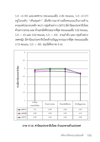 %u0e20%u0e32%u0e1e 4-16: %u0e04%u0e48%u0e32%u0e19%u0e34%u0e22%u0e21%u0e1b%u0e23%u0e30%u0e0a%u0e32%u0e18%u0e34%u0e1b%u0e44%u0e15%u0e22 %u0e08 %u0e32%u0e41%u0e19%u0e01%u0e15%u0e32%u0e21%u0e15%u0e31%u0e27%u0e41%u0e1b%u0e23%u0e40%u0e1e%u0e28%u0e04%u0e48%u0e32%u0e19%u0e34%u0e22%u0e21%u0e1b%u0e23%u0e30%u0e0a%u0e32%u0e18%u0e34%u0e1b%u0e44%u0e15%u0e22 %u0e14%u0e49%u0e32%u0e19%u0e04%u0e32%u0e23%u0e27%u0e18%u0e23%u0e23%u0e21 %u0e14%u0e49%u0e32%u0e19%u0e2a%u0e32%u0e21%u0e31%u0e04%u0e04%u0e35%u0e18%u0e23%u0e23%u0e21 %u0e14%u0e49%u0e32%u0e19%u0e1b%u0e31%u0e0d%u0e0d%u0e32%u0e18%u0e23%u0e23%u0e21%u0e40%u0e1e%u0e28%u0e0a%u0e32%u0e22 2.8 2.84 2.82 2.69%u0e40%u0e1e%u0e28%u0e2b%u0e0d%u0e34%u0e07 2.89 2.94 2.95 2.72LGBTQ 2.94 3.02 3.02 2.6811.522.533.54%u0e04%u0e48%u0e32%u0e40%u0e09%u0e25%u0e35%u0e48%u0e22%u0e04%u0e48%u0e32%u0e19%u0e34%u0e22%u0e21%u0e1b%u0e23%u0e30%u0e0a%u0e32%u0e18%u0e34%u0e1b%u0e44%u0e15%u0e22105S.D =0.39) %u0e41%u0e25%u0e30%u0e40%u0e1e%u0e28%u0e0a%u0e32%u0e22 (%u0e04%u0e30%u0e41%u0e19%u0e19%u0e40%u0e09%u0e25%u0e35%u0e48%u0e22 2.80 %u0e04%u0e30%u0e41%u0e19%u0e19, S.D =0.37) %u0e2d%u0e22%u0e39%u0e48%u0e43%u0e19%u0e23%u0e30%u0e14%u0e31%u0e1a %u201c%u0e40%u0e2b%u0e47%u0e19%u0e04%u0e38%u0e13%u0e04%u0e48%u0e32%u201d %u0e40%u0e21%u0e37%u0e48%u0e2d%u0e1e%u0e34%u0e08%u0e32%u0e23%u0e13%u0e32%u0e04%u0e48%u0e32%u0e40%u0e09%u0e25%u0e35%u0e48%u0e22%u0e04%u0e30%u0e41%u0e19%u0e19%u0e40%u0e1b%u0e47%u0e19%u0e23%u0e32%u0e22%u0e14%u0e49%u0e32%u0e19%u0e15%u0e32%u0e21%u0e2d%u0e07%u0e04%u0e4c%u0e1b%u0e23%u0e30%u0e01%u0e2d%u0e1a%u0e2b%u0e25%u0e31%u0e01 %u0e1e%u0e1a%u0e27%u0e48%u0e32 %u0e01%u0e25%u0e38%u0e48%u0e21%u0e15%u0e31%u0e27%u0e2d%u0e22%u0e48%u0e32%u0e07 LGBTQ %u0e21%u0e35%u0e04%u0e48%u0e32%u0e19%u0e34%u0e22%u0e21%u0e1b%u0e23%u0e30%u0e0a%u0e32%u0e18%u0e34%u0e1b%u0e44%u0e15%u0e22 %u0e14%u0e49%u0e32%u0e19%u0e04%u0e32%u0e23%u0e27%u0e18%u0e23%u0e23%u0e21 %u0e41%u0e25%u0e30 %u0e14%u0e49%u0e32%u0e19%u0e2a%u0e32%u0e21%u0e31%u0e04%u0e04%u0e35%u0e18%u0e23%u0e23%u0e21%u0e21%u0e32%u0e01%u0e17%u0e35%u0e48%u0e2a%u0e38%u0e14 (%u0e04%u0e30%u0e41%u0e19%u0e19%u0e40%u0e09%u0e25%u0e35%u0e48%u0e22 3.02 %u0e04%u0e30%u0e41%u0e19%u0e19, S.D. = .43 %u0e41%u0e25%u0e30 3.02 %u0e04%u0e30%u0e41%u0e19%u0e19, S.D. = .43) %u0e15%u0e32%u0e21%u0e25%ufffd%u0e33%u0e14%u0e31%u0e1a %u0e41%u0e25%u0e30 %u0e01%u0e25%u0e38%u0e48%u0e21%u0e15%u0e31%u0e27%u0e2d%u0e22%u0e48%u0e32%u0e07%u0e40%u0e1e%u0e28%u0e2b%u0e0d%u0e34%u0e07 %u0e21%u0e35%u0e04%u0e48%u0e32%u0e19%u0e34%u0e22%u0e21%u0e1b%u0e23%u0e30%u0e0a%u0e32%u0e18%u0e34%u0e1b%u0e44%u0e15%u0e22%u0e14%u0e49%u0e32%u0e19%u0e1b%u0e31%u0e0d%u0e0d%u0e32%u0e18%u0e23%u0e23%u0e21%u0e21%u0e32%u0e01%u0e17%u0e35%u0e48%u0e2a%u0e38%u0e14 (%u0e04%u0e30%u0e41%u0e19%u0e19%u0e40%u0e09%u0e25%u0e35%u0e48%u0e22 2.72 %u0e04%u0e30%u0e41%u0e19%u0e19, S.D. = .40) %u0e2a%u0e23%u0e38%u0e1b%u0e44%u0e14%u0e49%u0e14%u0e31%u0e07%u0e20%u0e32%u0e1e 4-16%u0e20%u0e32%u0e1e 4-16: %u0e04%u0e48%u0e32%u0e19%u0e34%u0e22%u0e21%u0e1b%u0e23%u0e30%u0e0a%u0e32%u0e18%u0e34%u0e1b%u0e44%u0e15%u0e22 %u0e08%ufffd%u0e33%u0e41%u0e19%u0e01%u0e15%u0e32%u0e21%u0e15%u0e31%u0e27%u0e41%u0e1b%u0e23%u0e40%u0e1e%u0e28