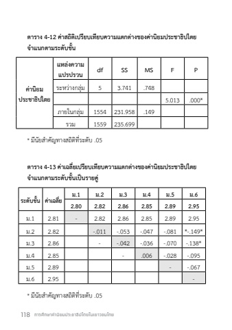 118 %u0e01%u0e32%u0e23%u0e28%u0e36%u0e01%u0e29%u0e32%u0e04%u0e48%u0e32%u0e19%u0e34%u0e22%u0e21%u0e1b%u0e23%u0e30%u0e0a%u0e32%u0e18%u0e34%u0e1b%u0e44%u0e15%u0e22%u0e43%u0e19%u0e40%u0e22%u0e32%u0e27%u0e0a%u0e19%u0e44%u0e17%u0e22%u0e15%u0e32%u0e23%u0e32%u0e07 4-12 %u0e04%u0e48%u0e32%u0e2a%u0e16%u0e34%u0e15%u0e34%u0e40%u0e1b%u0e23%u0e35%u0e22%u0e1a%u0e40%u0e17%u0e35%u0e22%u0e1a%u0e04%u0e27%u0e32%u0e21%u0e41%u0e15%u0e01%u0e15%u0e48%u0e32%u0e07%u0e02%u0e2d%u0e07%u0e04%u0e48%u0e32%u0e19%u0e34%u0e22%u0e21%u0e1b%u0e23%u0e30%u0e0a%u0e32%u0e18%u0e34%u0e1b%u0e44%u0e15%u0e22 %u0e08%ufffd%u0e33%u0e41%u0e19%u0e01%u0e15%u0e32%u0e21%u0e23%u0e30%u0e14%u0e31%u0e1a%u0e0a%u0e31%u0e49%u0e19%u0e04%u0e48%u0e32%u0e19%u0e34%u0e22%u0e21%u0e1b%u0e23%u0e30%u0e0a%u0e32%u0e18%u0e34%u0e1b%u0e44%u0e15%u0e22%u0e41%u0e2b%u0e25%u0e48%u0e07%u0e04%u0e27%u0e32%u0e21%u0e41%u0e1b%u0e23%u0e1b%u0e23%u0e27%u0e19df SS MS F P%u0e23%u0e30%u0e2b%u0e27%u0e48%u0e32%u0e07%u0e01%u0e25%u0e38%u0e48%u0e21 5 3.741 .7485.013 .000*%u0e20%u0e32%u0e22%u0e43%u0e19%u0e01%u0e25%u0e38%u0e48%u0e21 1554 231.958 .149%u0e23%u0e27%u0e21 1559 235.699* %u0e21%u0e35%u0e19%u0e31%u0e22%u0e2a%ufffd%u0e33%u0e04%u0e31%u0e0d%u0e17%u0e32%u0e07%u0e2a%u0e16%u0e34%u0e15%u0e34%u0e17%u0e35%u0e48%u0e23%u0e30%u0e14%u0e31%u0e1a .05%u0e15%u0e32%u0e23%u0e32%u0e07 4-13 %u0e04%u0e48%u0e32%u0e40%u0e09%u0e25%u0e35%u0e48%u0e22%u0e40%u0e1b%u0e23%u0e35%u0e22%u0e1a%u0e40%u0e17%u0e35%u0e22%u0e1a%u0e04%u0e27%u0e32%u0e21%u0e41%u0e15%u0e01%u0e15%u0e48%u0e32%u0e07%u0e02%u0e2d%u0e07%u0e04%u0e48%u0e32%u0e19%u0e34%u0e22%u0e21%u0e1b%u0e23%u0e30%u0e0a%u0e32%u0e18%u0e34%u0e1b%u0e44%u0e15%u0e22 %u0e08%ufffd%u0e33%u0e41%u0e19%u0e01%u0e15%u0e32%u0e21%u0e23%u0e30%u0e14%u0e31%u0e1a%u0e0a%u0e31%u0e49%u0e19%u0e40%u0e1b%u0e47%u0e19%u0e23%u0e32%u0e22%u0e04%u0e39%u0e48%u0e23%u0e30%u0e14%u0e31%u0e1a%u0e0a%u0e31%u0e49%u0e19 %u0e04%u0e48%u0e32%u0e40%u0e09%u0e25%u0e35%u0e48%u0e22 %u0e21.1 %u0e21.2 %u0e21.3 %u0e21.4 %u0e21.5 %u0e21.62.80 2.82 2.86 2.85 2.89 2.95%u0e21.1 2.81 - 2.82 2.86 2.85 2.89 2.95%u0e21.2 2.82 -.011 -.053 -.047 -.081 *-.149*%u0e21.3 2.86 - -.042 -.036 -.070 -.138*%u0e21.4 2.85 - .006 -.028 -.095%u0e21.5 2.89 - -.067%u0e21.6 2.95 -* %u0e21%u0e35%u0e19%u0e31%u0e22%u0e2a%ufffd%u0e33%u0e04%u0e31%u0e0d%u0e17%u0e32%u0e07%u0e2a%u0e16%u0e34%u0e15%u0e34%u0e17%u0e35%u0e48%u0e23%u0e30%u0e14%u0e31%u0e1a .05