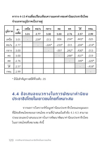 120 %u0e01%u0e32%u0e23%u0e28%u0e36%u0e01%u0e29%u0e32%u0e04%u0e48%u0e32%u0e19%u0e34%u0e22%u0e21%u0e1b%u0e23%u0e30%u0e0a%u0e32%u0e18%u0e34%u0e1b%u0e44%u0e15%u0e22%u0e43%u0e19%u0e40%u0e22%u0e32%u0e27%u0e0a%u0e19%u0e44%u0e17%u0e22%u0e15%u0e32%u0e23%u0e32%u0e07 4-15 %u0e04%u0e48%u0e32%u0e40%u0e09%u0e25%u0e35%u0e48%u0e22%u0e40%u0e1b%u0e23%u0e35%u0e22%u0e1a%u0e40%u0e17%u0e35%u0e22%u0e1a%u0e04%u0e27%u0e32%u0e21%u0e41%u0e15%u0e01%u0e15%u0e48%u0e32%u0e07%u0e02%u0e2d%u0e07%u0e04%u0e48%u0e32%u0e19%u0e34%u0e22%u0e21%u0e1b%u0e23%u0e30%u0e0a%u0e32%u0e18%u0e34%u0e1b%u0e44%u0e15%u0e22 %u0e08%ufffd%u0e33%u0e41%u0e19%u0e01%u0e15%u0e32%u0e21%u0e20%u0e39%u0e21%u0e34%u0e20%u0e32%u0e04%u0e40%u0e1b%u0e47%u0e19%u0e23%u0e32%u0e22%u0e04%u0e39%u0e48%u0e20%u0e39%u0e21%u0e34%u0e20%u0e32%u0e04%u0e04%u0e48%u0e32%u0e40%u0e09%u0e25%u0e35%u0e48%u0e22%u0e40%u0e2b%u0e19%u0e37%u0e2d %u0e15%u0e2d/%u0e19 %u0e01%u0e25%u0e32%u0e07 %u0e15%u0e2d %u0e15%u0e15 %u0e43%u0e15%u0e49 %u0e01%u0e17%u0e21.3.01 2.77 3.00 3.00 2.76 2.57 2.99%u0e40%u0e2b%u0e19%u0e37%u0e2d 3.01 - .239* .013 .006 .254* .443* .025%u0e15%u0e2d/%u0e19 2.77 - -.226* -.233* .015 .204* -.214*%u0e01%u0e25%u0e32%u0e07 3.00 - -.007 .242* .430* .013%u0e15%u0e2d 3.00 - .248* .437* .019%u0e15%u0e15 2.76 - .189* -.229*%u0e43%u0e15%u0e49 2.57 - -.418*%u0e01%u0e17%u0e21. 2.99 -* %u0e21%u0e35%u0e19%u0e31%u0e22%u0e2a%ufffd%u0e33%u0e04%u0e31%u0e0d%u0e17%u0e32%u0e07%u0e2a%u0e16%u0e34%u0e15%u0e34%u0e17%u0e35%u0e48%u0e23%u0e30%u0e14%u0e31%u0e1a .054.4 %u0e02%u0e49%u0e2d%u0e40%u0e2a%u0e19%u0e2d%u0e41%u0e19%u0e27%u0e17%u0e32%u0e07%u0e43%u0e19%u0e01%u0e32%u0e23%u0e1e%u0e31%u0e12%u0e19%u0e32%u0e04%u0e48%u0e32%u0e19%u0e34%u0e22%u0e21%u0e1b%u0e23%u0e30%u0e0a%u0e32%u0e18%u0e34%u0e1b%u0e44%u0e15%u0e22%u0e43%u0e19%u0e40%u0e22%u0e32%u0e27%u0e0a%u0e19%u0e44%u0e17%u0e22%u0e17%u0e35%u0e48%u0e40%u0e2b%u0e21%u0e32%u0e30%u0e2a%u0e21%u0e08%u0e32%u0e01%u0e1c%u0e25%u0e01%u0e32%u0e23%u0e27%u0e34%u0e40%u0e04%u0e23%u0e32%u0e30%u0e2b%u0e4c%u0e02%u0e49%u0e2d%u0e21%u0e39%u0e25%u0e04%u0e48%u0e32%u0e19%u0e34%u0e22%u0e21%u0e1b%u0e23%u0e30%u0e0a%u0e32%u0e18%u0e34%u0e1b%u0e44%u0e15%u0e22%u0e41%u0e25%u0e30%u0e21%u0e38%u0e21%u0e21%u0e2d%u0e07%u0e17%u0e35%u0e48%u0e21%u0e35%u0e15%u0e48%u0e2d%u0e2a%u0e31%u0e07%u0e04%u0e21%u0e44%u0e17%u0e22%u0e02%u0e2d%u0e07%u0e40%u0e22%u0e32%u0e27%u0e0a%u0e19%u0e44%u0e17%u0e22 %u0e15%u0e32%u0e21%u0e17%u0e35%u0e48%u0e19%ufffd%u0e33%u0e40%u0e2a%u0e19%u0e2d%u0e43%u0e19%u0e2b%u0e31%u0e27%u0e02%u0e49%u0e2d 4.1-4.3 %u0e2a%u0e32%u0e21%u0e32%u0e23%u0e16%u0e1b%u0e23%u0e30%u0e21%u0e27%u0e25%u0e41%u0e25%u0e30%u0e19%ufffd%u0e33%u0e40%u0e2a%u0e19%u0e2d%u0e41%u0e19%u0e27%u0e17%u0e32%u0e07%u0e43%u0e19%u0e01%u0e32%u0e23%u0e1e%u0e31%u0e12%u0e19%u0e32%u0e1e%u0e31%u0e12%u0e19%u0e32%u0e04%u0e48%u0e32%u0e19%u0e34%u0e22%u0e21%u0e1b%u0e23%u0e30%u0e0a%u0e32%u0e18%u0e34%u0e1b%u0e44%u0e15%u0e22%u0e43%u0e19%u0e40%u0e22%u0e32%u0e27%u0e0a%u0e19%u0e44%u0e17%u0e22%u0e17%u0e35%u0e48%u0e40%u0e2b%u0e21%u0e32%u0e30%u0e2a%u0e21 %u0e14%u0e31%u0e07%u0e19%u0e35%u0e49