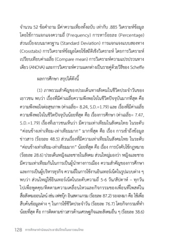 128 %u0e01%u0e32%u0e23%u0e28%u0e36%u0e01%u0e29%u0e32%u0e04%u0e48%u0e32%u0e19%u0e34%u0e22%u0e21%u0e1b%u0e23%u0e30%u0e0a%u0e32%u0e18%u0e34%u0e1b%u0e44%u0e15%u0e22%u0e43%u0e19%u0e40%u0e22%u0e32%u0e27%u0e0a%u0e19%u0e44%u0e17%u0e22%u0e08%ufffd%u0e33%u0e19%u0e27%u0e19 52 %u0e02%u0e49%u0e2d%u0e04%ufffd%u0e33%u0e16%u0e32%u0e21 %u0e21%u0e35%u0e04%u0e48%u0e32%u0e04%u0e27%u0e32%u0e21%u0e40%u0e17%u0e35%u0e48%u0e22%u0e07%u0e17%u0e31%u0e49%u0e07%u0e09%u0e1a%u0e31%u0e1a %u0e40%u0e17%u0e48%u0e32%u0e01%u0e31%u0e1a .885 %u0e27%u0e34%u0e40%u0e04%u0e23%u0e32%u0e30%u0e2b%u0e4c%u0e02%u0e49%u0e2d%u0e21%u0e39%u0e25 %u0e42%u0e14%u0e22%u0e43%u0e0a%u0e49%u0e01%u0e32%u0e23%u0e41%u0e08%u0e01%u0e41%u0e08%u0e07%u0e04%u0e27%u0e32%u0e21%u0e16%u0e35%u0e48 (Frequency) %u0e01%u0e32%u0e23%u0e2b%u0e32%u0e23%u0e49%u0e2d%u0e22%u0e25%u0e30 (Percentage) %u0e2a%u0e48%u0e27%u0e19%u0e40%u0e1a%u0e35%u0e48%u0e22%u0e07%u0e40%u0e1a%u0e19%u0e21%u0e32%u0e15%u0e23%u0e10%u0e32%u0e19 (Standard Deviation) %u0e01%u0e32%u0e23%u0e41%u0e08%u0e01%u0e41%u0e08%u0e07%u0e41%u0e1a%u0e1a%u0e2a%u0e2d%u0e07%u0e17%u0e32%u0e07 (Crosstabs) %u0e01%u0e32%u0e23%u0e27%u0e34%u0e40%u0e04%u0e23%u0e32%u0e30%u0e2b%u0e4c%u0e02%u0e49%u0e2d%u0e21%u0e39%u0e25%u0e42%u0e14%u0e22%u0e43%u0e0a%u0e49%u0e2a%u0e16%u0e34%u0e15%u0e34%u0e40%u0e0a%u0e34%u0e07%u0e27%u0e34%u0e40%u0e04%u0e23%u0e32%u0e30%u0e2b%u0e4c %u0e42%u0e14%u0e22%u0e01%u0e32%u0e23%u0e27%u0e34%u0e40%u0e04%u0e23%u0e32%u0e30%u0e2b%u0e4c%u0e40%u0e1b%u0e23%u0e35%u0e22%u0e1a%u0e40%u0e17%u0e35%u0e22%u0e1a%u0e04%u0e48%u0e32%u0e40%u0e09%u0e25%u0e35%u0e48%u0e22 (Compare mean) %u0e01%u0e32%u0e23%u0e27%u0e34%u0e40%u0e04%u0e23%u0e32%u0e30%u0e2b%u0e4c%u0e04%u0e27%u0e32%u0e21%u0e41%u0e1b%u0e23%u0e1b%u0e23%u0e27%u0e19%u0e17%u0e32%u0e07%u0e40%u0e14%u0e35%u0e22%u0e27 (ANOVA) %u0e41%u0e25%u0e30%u0e01%u0e32%u0e23%u0e27%u0e34%u0e40%u0e04%u0e23%u0e32%u0e30%u0e2b%u0e4c%u0e04%u0e27%u0e32%u0e21%u0e41%u0e15%u0e01%u0e15%u0e48%u0e32%u0e07%u0e40%u0e1b%u0e47%u0e19%u0e23%u0e32%u0e22%u0e04%u0e39%u0e48%u0e14%u0e49%u0e27%u0e22%u0e27%u0e34%u0e18%u0e35%u0e02%u0e2d%u0e07 Scheffe%u0e1c%u0e25%u0e01%u0e32%u0e23%u0e28%u0e36%u0e01%u0e29%u0e32 %u0e2a%u0e23%u0e38%u0e1b%u0e44%u0e14%u0e49%u0e14%u0e31%u0e07%u0e19%u0e35%u0e49 (1) %u0e20%u0e32%u0e1e%u0e23%u0e27%u0e21%u0e2a%ufffd%u0e33%u0e04%u0e31%u0e0d%u0e02%u0e2d%u0e07%u0e1b%u0e23%u0e30%u0e40%u0e14%u0e47%u0e19%u0e17%u0e32%u0e07%u0e2a%u0e31%u0e07%u0e04%u0e21%u0e43%u0e19%u0e0a%u0e35%u0e27%u0e34%u0e15%u0e1b%u0e23%u0e30%u0e08%ufffd%u0e33%u0e27%u0e31%u0e19%u0e02%u0e2d%u0e07%u0e40%u0e22%u0e32%u0e27%u0e0a%u0e19 %u0e1e%u0e1a%u0e27%u0e48%u0e32 %u0e40%u0e23%u0e37%u0e48%u0e2d%u0e07%u0e17%u0e35%u0e48%u0e21%u0e35%u0e04%u0e48%u0e32%u0e40%u0e09%u0e25%u0e35%u0e48%u0e22%u0e04%u0e27%u0e32%u0e21%u0e1e%u0e36%u0e07%u0e1e%u0e2d%u0e43%u0e08%u0e43%u0e19%u0e0a%u0e35%u0e27%u0e34%u0e15%u0e1b%u0e31%u0e08%u0e08%u0e38%u0e1a%u0e31%u0e19%u0e21%u0e32%u0e01%u0e17%u0e35%u0e48%u0e2a%u0e38%u0e14 %u0e04%u0e37%u0e2d %u0e04%u0e27%u0e32%u0e21%u0e1e%u0e36%u0e07%u0e1e%u0e2d%u0e43%u0e08%u0e15%u0e48%u0e2d%u0e2a%u0e38%u0e02%u0e20%u0e32%u0e1e (%u0e04%u0e48%u0e32%u0e40%u0e09%u0e25%u0e35%u0e48%u0e22= 8.24, S.D.=1.79) %u0e41%u0e25%u0e30 %u0e40%u0e23%u0e37%u0e48%u0e2d%u0e07%u0e17%u0e35%u0e48%u0e21%u0e35%u0e04%u0e48%u0e32%u0e40%u0e09%u0e25%u0e35%u0e48%u0e22%u0e04%u0e27%u0e32%u0e21%u0e1e%u0e36%u0e07%u0e1e%u0e2d%u0e43%u0e08%u0e43%u0e19%u0e0a%u0e35%u0e27%u0e34%u0e15%u0e1b%u0e31%u0e08%u0e08%u0e38%u0e1a%u0e31%u0e19%u0e19%u0e49%u0e2d%u0e22%u0e17%u0e35%u0e48%u0e2a%u0e38%u0e14 %u0e04%u0e37%u0e2d %u0e40%u0e23%u0e37%u0e48%u0e2d%u0e07%u0e01%u0e32%u0e23%u0e28%u0e36%u0e01%u0e29%u0e32 (%u0e04%u0e48%u0e32%u0e40%u0e09%u0e25%u0e35%u0e48%u0e22= 7.47, S.D.=1.79) %u0e40%u0e23%u0e37%u0e48%u0e2d%u0e07%u0e17%u0e35%u0e48%u0e40%u0e22%u0e32%u0e27%u0e0a%u0e19%u0e40%u0e2b%u0e47%u0e19%u0e27%u0e48%u0e32 %u0e21%u0e35%u0e04%u0e27%u0e32%u0e21%u0e40%u0e17%u0e48%u0e32%u0e40%u0e17%u0e35%u0e22%u0e21%u0e43%u0e19%u0e2a%u0e31%u0e07%u0e04%u0e21%u0e44%u0e17%u0e22 %u0e43%u0e19%u0e23%u0e30%u0e14%u0e31%u0e1a %u201c%u0e04%u0e48%u0e2d%u0e19%u0e02%u0e49%u0e32%u0e07%u0e40%u0e17%u0e48%u0e32%u0e40%u0e17%u0e35%u0e22%u0e21-%u0e40%u0e17%u0e48%u0e32%u0e40%u0e17%u0e35%u0e22%u0e21%u0e21%u0e32%u0e01%u201d %u0e21%u0e32%u0e01%u0e17%u0e35%u0e48%u0e2a%u0e38%u0e14 %u0e04%u0e37%u0e2d %u0e40%u0e23%u0e37%u0e48%u0e2d%u0e07 %u0e01%u0e32%u0e23%u0e40%u0e02%u0e49%u0e32%u0e16%u0e36%u0e07%u0e02%u0e49%u0e2d%u0e21%u0e39%u0e25%u0e02%u0e48%u0e32%u0e27%u0e2a%u0e32%u0e23 (%u0e23%u0e49%u0e2d%u0e22%u0e25%u0e30 48.5) %u0e2a%u0e48%u0e27%u0e19%u0e40%u0e23%u0e37%u0e48%u0e2d%u0e07%u0e17%u0e35%u0e48%u0e21%u0e35%u0e04%u0e27%u0e32%u0e21%u0e40%u0e17%u0e48%u0e32%u0e40%u0e17%u0e35%u0e22%u0e21%u0e43%u0e19%u0e2a%u0e31%u0e07%u0e04%u0e21%u0e44%u0e17%u0e22 %u0e43%u0e19%u0e23%u0e30%u0e14%u0e31%u0e1a %u201c%u0e04%u0e48%u0e2d%u0e19%u0e02%u0e49%u0e32%u0e07%u0e40%u0e17%u0e48%u0e32%u0e40%u0e17%u0e35%u0e22%u0e21-%u0e40%u0e17%u0e48%u0e32%u0e40%u0e17%u0e35%u0e22%u0e21%u0e21%u0e32%u0e01%u201d %u0e19%u0e49%u0e2d%u0e22%u0e17%u0e35%u0e48%u0e2a%u0e38%u0e14 %u0e04%u0e37%u0e2d %u0e40%u0e23%u0e37%u0e48%u0e2d%u0e07 %u0e01%u0e32%u0e23%u0e1a%u0e31%u0e07%u0e04%u0e31%u0e1a%u0e43%u0e0a%u0e49%u0e01%u0e0e%u0e2b%u0e21%u0e32%u0e22 (%u0e23%u0e49%u0e2d%u0e22%u0e25%u0e30 28.6) %u0e1b%u0e23%u0e30%u0e40%u0e14%u0e47%u0e19%u0e2b%u0e0d%u0e34%u0e07%u0e41%u0e25%u0e30%u0e0a%u0e32%u0e22%u0e43%u0e19%u0e2a%u0e31%u0e07%u0e04%u0e21 %u0e2a%u0e48%u0e27%u0e19%u0e43%u0e2b%u0e0d%u0e48%u0e21%u0e2d%u0e07%u0e27%u0e48%u0e32 %u0e2b%u0e0d%u0e34%u0e07%u0e41%u0e25%u0e30%u0e0a%u0e32%u0e22%u0e21%u0e35%u0e04%u0e27%u0e32%u0e21%u0e40%u0e17%u0e48%u0e32%u0e40%u0e17%u0e35%u0e22%u0e21%u0e01%u0e31%u0e19%u0e43%u0e19%u0e01%u0e32%u0e23%u0e40%u0e1b%u0e47%u0e19%u0e1c%u0e39%u0e49%u0e19%ufffd%u0e33%u0e17%u0e32%u0e07%u0e01%u0e32%u0e23%u0e40%u0e21%u0e37%u0e2d%u0e07 %u0e04%u0e27%u0e32%u0e21%u0e2a%ufffd%u0e33%u0e04%u0e31%u0e0d%u0e02%u0e2d%u0e07%u0e01%u0e32%u0e23%u0e28%u0e36%u0e01%u0e29%u0e32 %u0e41%u0e25%u0e30%u0e01%u0e32%u0e23%u0e40%u0e1b%u0e47%u0e19%u0e1c%u0e39%u0e49%u0e1a%u0e23%u0e34%u0e2b%u0e32%u0e23%u0e18%u0e38%u0e23%u0e01%u0e3