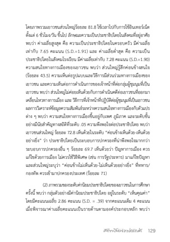 129%u0e42%u0e14%u0e22%u0e20%u0e32%u0e1e%u0e23%u0e27%u0e21%u0e40%u0e22%u0e32%u0e27%u0e0a%u0e19%u0e2a%u0e48%u0e27%u0e19%u0e43%u0e2b%u0e0d%u0e48%u0e23%u0e49%u0e2d%u0e22%u0e25%u0e30 81.8 %u0e43%u0e0a%u0e49%u0e40%u0e27%u0e25%u0e32%u0e44%u0e1b%u0e01%u0e31%u0e1a%u0e01%u0e32%u0e23%u0e43%u0e0a%u0e49%u0e2d%u0e34%u0e19%u0e40%u0e17%u0e2d%u0e23%u0e4c%u0e40%u0e19%u0e47%u0e15%u0e15%u0e31%u0e49%u0e07%u0e41%u0e15%u0e48 6 %u0e0a%u0e31%u0e48%u0e27%u0e42%u0e21%u0e07/%u0e27%u0e31%u0e19 %u0e02%u0e36%u0e49%u0e19%u0e44%u0e1b %u0e25%u0e31%u0e01%u0e29%u0e13%u0e30%u0e04%u0e27%u0e32%u0e21%u0e40%u0e1b%u0e47%u0e19%u0e1b%u0e23%u0e30%u0e0a%u0e32%u0e18%u0e34%u0e1b%u0e44%u0e15%u0e22%u0e43%u0e19%u0e2a%u0e31%u0e07%u0e04%u0e21%u0e17%u0e35%u0e48%u0e2d%u0e22%u0e39%u0e48%u0e2d%u0e32%u0e28%u0e31%u0e22 %u0e1e%u0e1a%u0e27%u0e48%u0e32 %u0e04%u0e48%u0e32%u0e40%u0e09%u0e25%u0e35%u0e48%u0e22%u0e2a%u0e39%u0e07%u0e2a%u0e38%u0e14 %u0e04%u0e37%u0e2d %u0e04%u0e27%u0e32%u0e21%u0e40%u0e1b%u0e47%u0e19%u0e1b%u0e23%u0e30%u0e0a%u0e32%u0e18%u0e34%u0e1b%u0e44%u0e15%u0e22%u0e43%u0e19%u0e04%u0e23%u0e2d%u0e1a%u0e04%u0e23%u0e31%u0e27 %u0e21%u0e35%u0e04%u0e48%u0e32%u0e40%u0e09%u0e25%u0e35%u0e48%u0e22%u0e40%u0e17%u0e48%u0e32%u0e01%u0e31%u0e1a 7.65 %u0e04%u0e30%u0e41%u0e19%u0e19 (S.D.=1.91) %u0e41%u0e25%u0e30 %u0e04%u0e48%u0e32%u0e40%u0e09%u0e25%u0e35%u0e48%u0e22%u0e15%ufffd%u0e48%u0e33%u0e2a%u0e38%u0e14 %u0e04%u0e37%u0e2d %u0e04%u0e27%u0e32%u0e21%u0e40%u0e1b%u0e47%u0e19%u0e1b%u0e23%u0e30%u0e0a%u0e32%u0e18%u0e34%u0e1b%u0e44%u0e15%u0e22%u0e43%u0e19%u0e2a%u0e31%u0e07%u0e04%u0e21%u0e42%u0e23%u0e07%u0e40%u0e23%u0e35%u0e22%u0e19 %u0e21%u0e35%u0e04%u0e48%u0e32%u0e40%u0e09%u0e25%u0e35%u0e48%u0e22%u0e40%u0e17%u0e48%u0e32%u0e01%u0e31%u0e1a 7.28 %u0e04%u0e30%u0e41%u0e19%u0e19 (S.D.=1.90) %u0e04%u0e27%u0e32%u0e21%u0e2a%u0e19%u0e43%u0e08%u0e17%u0e32%u0e07%u0e01%u0e32%u0e23%u0e40%u0e21%u0e37%u0e2d%u0e07%u0e02%u0e2d%u0e07%u0e40%u0e22%u0e32%u0e27%u0e0a%u0e19 %u0e1e%u0e1a%u0e27%u0e48%u0e32 %u0e2a%u0e48%u0e27%u0e19%u0e43%u0e2b%u0e0d%u0e48%u0e23%u0e39%u0e49%u0e2a%u0e36%u0e01%u0e04%u0e48%u0e2d%u0e19%u0e02%u0e49%u0e32%u0e07%u0e2a%u0e19%u0e43%u0e08 (%u0e23%u0e49%u0e2d%u0e22%u0e25%u0e30 43.5) %u0e04%u0e27%u0e32%u0e21%u0e40%u0e2b%u0e47%u0e19%u0e15%u0e48%u0e2d%u0e23%u0e39%u0e1b%u0e41%u0e1a%u0e1a%u0e41%u0e25%u0e30%u0e27%u0e34%u0e18%u0e35%u0e01%u0e32%u0e23%u0e21%u0e35%u0e2a%u0e48%u0e27%u0e19%u0e23%u0e48%u0e27%u0e21%u0e17%u0e32%u0e07%u0e01%u0e32%u0e23%u0e40%u0e21%u0e37%u0e2d%u0e07%u0e02%u0e2d%u0e07%u0e40%u0e22%u0e32%u0e27%u0e0a%u0e19 %u0e41%u0e25%u0e30%u0e04%u0e27%u0e32%u0e21%u0e40%u0e2b%u0e47%u0e19%u0e15%u0e48%u0e2d%u0e01%u0e32%u0e23%u0e14%ufffd%u0e33%u0e40%u0e19%u0e34%u0e19%u0e01%u0e32%u0e23%u0e02%u0e2d%u0e07%u0e40%u0e08%u0e49%u0e32%u0e2b%u0e19%u0e49%u0e32%u0e17%u0e35%u0e48%u0e15%u0e48%u0e2d%u0e01%u0e25%u0e38%u0e48%u0e21%u0e1c%u0e39%u0e49%u0e0a%u0e38%u0e21%u0e19%u0e38%u0e21%u0e17%u0e35%u0e48%u0e40%u0e1b%u0e47%u0e19%u0e40%u0e22%u0e32%u0e27%u0e0a%u0e19 %u0e1e%u0e1a%u0e27%u0e48%u0e32 %u0e2a%u0e48%u0e27%u0e19%u0e43%u0e2b%u0e0d%u0e48%u0e44%u0e21%u0e48%u0e04%u0e48%u0e2d%u0e22%u0e40%u0e2b%u0e47%u0e19%u0e14%u0e49%u0e27%u0e22%u0e01%u0e31%u0e1a%u0e01%u0e32%u0e23%u0e14%ufffd%u0e33%u0e40%u0e19%u0e34%u0e19%u0e04%u0e14%u0e35%u0e15%u0e48%u0e2d%u0e40%u0e22%u0e32%u0e27%u0e0a%u0e19%u0e17%u0e35%u0e48%u0e2d%u0e2d%u0e01%u0e21%u0e32%u0e40%u0e04%u0e25%u0e37%u0e48%u0e2d%u0e19%u0e44%u0e2b%u0e27%u0e17%u0e32%u0e07%u0e01%u0e32%u0e23%u0e40%u0e21%u0e37%u0e2d%u0e07 %u0e41%u0e25%u0e30 %u0e27%u0e34%u0e18%u0e35%u0e01%u0e32%u0e23%u0e17%u0e35%u0e48%u0e40%u0e08%u0e49%u0e32%u0e2b%u0e19%u0e49%u0e32%u0e17%u0e35%u0e48%u0e1b%u0e0f%u0e34%u0e1a%u0e31%u0e15%u0e34%u0e15%u0e48%u0e2d%u0e1c%u0e39%u0e49%u0e0a%u0e38%u0e21%u0e19%u0e38%u0e21%u0e17%u0e35%u0e48%u0e40%u0e1b%u0e47%u0e19%u0e40%u0e22%u0e32%u0e27%u0e0a%u0e19 %u0e1c%u0e25%u0e01%u0e32%u0e23%u0e27%u0e34%u0e40%u0e04%u0e23%u0e32%u0e30%u0e2b%u0e4c%u0e02%u0e49%u0e2d%u0e21%u0e39%u0e25%u0e04%u0e27%u0e32%u0e21%u0e2a%u0e31%u0e21%u0e1e%u0e31%u0e19%u0e18%u0e4c%u0e23%u0e30%u0e2b%u0e27%u0e48%u0e32%u0e07%u0e04%u0e27%u0e32%u0e21%u0e2a%u0e19%u0e43%u0e08%u0e17%u0e32%u0e07%u0e01%u0e32%u0e23%u0e40%u0e21%u0e37%u0e2d%u0e07%u0e01%u0e31%u0e1a%u0e15%u0e31%u0e27%u0e41%u0e1b%u0e23%u0e15%u0e48%u0e32%u0e07 %u0e46 %u0e1e%u0e1a%u0e27%u0e48%u0e32 %u0e04%u0e27%u0e32%u0e21%u0e2a%u0e19%u0e43%u0e08%u0e17%u0e32%u0e07%u0e01%u0e32%u0e23%u0e40%u0e21%u0e37%u0e2d%u0e07%u0e02%u0e36%u0e49%u0e19%u0e2d%u0e22%u0e39%u0e48%u0e01%u0e31%u0e1a%u0e40%u0e1e%u0e28 %u0e20%u0e39%u0e21%u0e34%u0e20%u0e32%u0e04 %u0e41%u0e25%u0e30%u0e23%u0e30%u0e14%u0e31%u0e1a%u0e0a%u0e31%u0e49%u0e19 %u0e2d%u0e22%u0e48%u0e32%u0e07%u0e21%u0e35%u0e19%u0e31%u0e22%u0e2a%ufffd%u0e33%u0e04%u0e31%u0e0d%u0e17%u0e32%u0e07%u0e2a%u0e16%u0e34%u0e15%u0e34%u0e17%u0e35%u0e48%u0e23%u0e30%u0e14%u0e31%u0e1a .05 %u0e04%u0e27%u0e32%u0e21%u0e1e%u0e36%u0e07%u0e1e%u0e2d%u0e43%u0e08%u0e15%u0e48%u0e2d%u0e1b%u0e23%u0e30%u0e0a%u0e32%u0e18%u0e34%u0e1b%u0e44%u0e15%u0e22 %u0e1e%u0e1a%u0e27%u0e48%u0e32 %u0e40%u0e22%u0e32%u0e27%u0e0a%u0e19%u0e2a%u0e48%u0e27%u0e19%u0e43%u0e2b%u0e0d%u0e48 %u0e23%u0e49%u0e2d%u0e22%u0e25%u0e30 72.8 %u0e40%u0e2b%u0e47%u0e19%u0e14%u0e49%u0e27%u0e22%u0e43%u0e19%u0e23%u0e30%u0e14%u0e31%u0e1a %u201c%u0e04%u0e48%u0e2d%u0e19%u0e02%u0e49%u0e32%u0e07%u0e40%u0e2b%u0e47%u0e19%u0e14%u0e49%u0e27%u0e22-%u0e40%u0e2b%u0e47%u0e19%u0e14%u0e49%u0e27%u0e22%u0e2d%u0e22%u0e48%u0e32%u0e07%u0e22%u0e34%u0e48%u0e07%u201d %u0e27%u0e48%u0e32 %u0e1b%u0e23%u0e30%u0e0a%u0e32%u0e18%u0e34%u0e1b%u0e44%u0e15%u0e22%u0e40%u0e1b%uf712%u0e19%u0e23%u0e30%u0e1a%u0e2d%u0e1a%u0e01%u0e32%u0e23%u0e1b%u0e01%u0e04%u0e23%u0e2d%u0e07%u0e17%u0e35%u0e48%u0e19%u0e48%u0e32%u0e1e%u0e36%u0e07%u0e1e%u0e2d%u0e43%u0e08%u0e21%u0e32%u0e01%u0e01%u0e27%uf70a%u0e32%u0e23%u0e30%u0e1a%u0e2d%u0e1a%u0e01%u0e32%u0e23%u0e1b%u0e01%u0e04%u0e23%u0e2d%u0e07%u0e2d%u0e37%u0e48%u0e19 %u0e46 %u0e23%u0e49%u0e2d%u0e22%u0e25%u0e30 69.7 %u0e40%u0e2b%u0e47%u0e19%u0e14%u0e49%u0e27%u0e22%u0e27%u0e48%u0e32 %u0e1b%u0e31%u0e0d%u0e2b%u0e32%u0e01%u0e32%u0e23%u0e40%u0e21%u0e37%u0e2d%u0e07 %u0e04%u0e27%u0e23%u0e41%u0e01%u0e49%u0e44%u0e02%