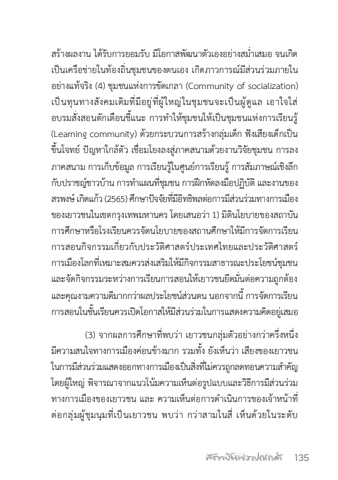 135%u0e2a%u0e23%u0e49%u0e32%u0e07%u0e1c%u0e25%u0e07%u0e32%u0e19 %u0e44%u0e14%u0e49%u0e23%u0e31%u0e1a%u0e01%u0e32%u0e23%u0e22%u0e2d%u0e21%u0e23%u0e31%u0e1a %u0e21%u0e35%u0e42%u0e2d%u0e01%u0e32%u0e2a%u0e1e%u0e31%u0e12%u0e19%u0e32%u0e15%u0e31%u0e27%u0e40%u0e2d%u0e07%u0e2d%u0e22%u0e48%u0e32%u0e07%u0e2a%u0e21%ufffd%u0e48%u0e33%u0e40%u0e2a%u0e21%u0e2d %u0e08%u0e19%u0e40%u0e01%u0e34%u0e14%u0e40%u0e1b%u0e47%u0e19%u0e40%u0e04%u0e23%u0e37%u0e2d%u0e02%u0e48%u0e32%u0e22%u0e43%u0e19%u0e17%u0e49%u0e2d%u0e07%u0e16%u0e34%u0e48%u0e19%u0e0a%u0e38%u0e21%u0e0a%u0e19%u0e02%u0e2d%u0e07%u0e15%u0e19%u0e40%u0e2d%u0e07 %u0e40%u0e01%u0e34%u0e14%u0e20%u0e32%u0e27%u0e01%u0e32%u0e23%u0e13%u0e4c%u0e21%u0e35%u0e2a%u0e48%u0e27%u0e19%u0e23%u0e48%u0e27%u0e21%u0e20%u0e32%u0e22%u0e43%u0e19%u0e2d%u0e22%u0e48%u0e32%u0e07%u0e41%u0e17%u0e49%u0e08%u0e23%u0e34%u0e07 (4) %u0e0a%u0e38%u0e21%u0e0a%u0e19%u0e41%u0e2b%u0e48%u0e07%u0e01%u0e32%u0e23%u0e02%u0e31%u0e14%u0e40%u0e01%u0e25%u0e32 (Community of socialization) %u0e40%u0e1b%u0e47%u0e19%u0e17%u0e38%u0e19%u0e17%u0e32%u0e07%u0e2a%u0e31%u0e07%u0e04%u0e21%u0e40%u0e14%u0e34%u0e21%u0e17%u0e35%u0e48%u0e21%u0e35%u0e2d%u0e22%u0e39%u0e48%u0e17%u0e35%u0e48%u0e1c%u0e39%u0e49%u0e43%u0e2b%u0e0d%u0e48%u0e43%u0e19%u0e0a%u0e38%u0e21%u0e0a%u0e19%u0e08%u0e30%u0e40%u0e1b%u0e47%u0e19%u0e1c%u0e39%u0e49%u0e14%u0e39%u0e41%u0e25 %u0e40%u0e2d%u0e32%u0e43%u0e08%u0e43%u0e2a%u0e48 %u0e2d%u0e1a%u0e23%u0e21%u0e2a%u0e31%u0e48%u0e07%u0e2a%u0e2d%u0e19%u0e15%u0e31%u0e01%u0e40%u0e15%u0e37%u0e2d%u0e19%u0e0a%u0e35%u0e49%u0e41%u0e19%u0e30 %u0e01%u0e32%u0e23%u0e17%ufffd%u0e33%u0e43%u0e2b%u0e49%u0e0a%u0e38%u0e21%u0e0a%u0e19%u0e43%u0e2b%u0e49%u0e40%u0e1b%u0e47%u0e19%u0e0a%u0e38%u0e21%u0e0a%u0e19%u0e41%u0e2b%u0e48%u0e07%u0e01%u0e32%u0e23%u0e40%u0e23%u0e35%u0e22%u0e19%u0e23%u0e39%u0e49 (Learning community) %u0e14%u0e49%u0e27%u0e22%u0e01%u0e23%u0e30%u0e1a%u0e27%u0e19%u0e01%u0e32%u0e23%u0e2a%u0e23%u0e49%u0e32%u0e07%u0e01%u0e25%u0e38%u0e48%u0e21%u0e40%u0e14%u0e47%u0e01 %u0e1f%u0e31%u0e07%u0e40%u0e2a%u0e35%u0e22%u0e07%u0e40%u0e14%u0e47%u0e01%u0e40%u0e1b%u0e47%u0e19 %u0e02%u0e36%u0e49%u0e19%u0e42%u0e08%u0e17%u0e22%u0e4c %u0e1b%u0e31%u0e0d%u0e2b%u0e32%u0e43%u0e01%u0e25%u0e49%u0e15%u0e31%u0e27 %u0e40%u0e0a%u0e37%u0e48%u0e2d%u0e21%u0e42%u0e22%u0e07%u0e25%u0e07%u0e2a%u0e39%u0e48%u0e20%u0e32%u0e04%u0e2a%u0e19%u0e32%u0e21%u0e14%u0e49%u0e27%u0e22%u0e07%u0e32%u0e19%u0e27%u0e34%u0e08%u0e31%u0e22%u0e0a%u0e38%u0e21%u0e0a%u0e19 %u0e01%u0e32%u0e23%u0e25%u0e07%u0e20%u0e32%u0e04%u0e2a%u0e19%u0e32%u0e21 %u0e01%u0e32%u0e23%u0e40%u0e01%u0e47%u0e1a%u0e02%u0e49%u0e2d%u0e21%u0e39%u0e25 %u0e01%u0e32%u0e23%u0e40%u0e23%u0e35%u0e22%u0e19%u0e23%u0e39%u0e49%u0e43%u0e19%u0e28%u0e39%u0e19%u0e22%u0e4c%u0e01%u0e32%u0e23%u0e40%u0e23%u0e35%u0e22%u0e19%u0e23%u0e39%u0e49 %u0e01%u0e32%u0e23%u0e2a%u0e31%u0e21%u0e20%u0e32%u0e29%u0e13%u0e4c%u0e40%u0e0a%u0e34%u0e07%u0e25%u0e36%u0e01%u0e01%u0e31%u0e1a%u0e1b%u0e23%u0e32%u0e0a%u0e0d%u0e4c%u0e0a%u0e32%u0e27%u0e1a%u0e49%u0e32%u0e19 %u0e01%u0e32%u0e23%u0e17%ufffd%u0e33%u0e41%u0e1c%u0e19%u0e17%u0e35%u0e48%u0e0a%u0e38%u0e21%u0e0a%u0e19 %u0e01%u0e32%u0e23%u0e1d%u0e36%u0e01%u0e2b%u0e31%u0e14%u0e25%u0e07%u0e21%u0e37%u0e2d%u0e1b%u0e0f%u0e34%u0e1a%u0e31%u0e15%u0e34 %u0e41%u0e25%u0e30%u0e07%u0e32%u0e19%u0e02%u0e2d%u0e07 %u0e2a%u0e23%u0e1e%u0e07%u0e29%u0e4c %u0e40%u0e01%u0e34%u0e14%u0e41%u0e01%u0e49%u0e27 (2565) %u0e28%u0e36%u0e01%u0e29%u0e32%u0e1b%u0e31%u0e08%u0e08%u0e31%u0e22%u0e17%u0e35%u0e48%u0e21%u0e35%u0e2d%u0e34%u0e17%u0e18%u0e34%u0e1e%u0e25%u0e15%u0e48%u0e2d%u0e01%u0e32%u0e23%u0e21%u0e35%u0e2a%u0e48%u0e27%u0e19%u0e23%u0e48%u0e27%u0e21%u0e17%u0e32%u0e07%u0e01%u0e32%u0e23%u0e40%u0e21%u0e37%u0e2d%u0e07%u0e02%u0e2d%u0e07%u0e40%u0e22%u0e32%u0e27%u0e0a%u0e19%u0e43%u0e19%u0e40%u0e02%u0e15%u0e01%u0e23%u0e38%u0e07%u0e40%u0e17%u0e1e%u0e21%u0e2b%u0e32%u0e19%u0e04%u0e23 %u0e42%u0e14%u0e22%u0e40%u0e2a%u0e19%u0e2d%u0e27%u0e48%u0e32 1) %u0e21%u0e34%u0e15%u0e34%u0e19%u0e42%u0e22%u0e1a%u0e32%u0e22%u0e02%u0e2d%u0e07%u0e2a%u0e16%u0e32%u0e1a%u0e31%u0e19%u0e01%u0e32%u0e23%u0e28%u0e36%u0e01%u0e29%u0e32%u0e2b%u0e23%u0e37%u0e2d%u0e42%u0e23%u0e07%u0e40%u0e23%u0e35%u0e22%u0e19%u0e04%u0e27%u0e23%u0e08%u0e31%u0e14%u0e19%u0e42%u0e22%u0e1a%u0e32%u0e22%u0e02%u0e2d%u0e07%u0e2a%u0e16%u0e32%u0e19%u0e28%u0e36%u0e01%u0e29%u0e32%u0e43%u0e2b%u0e49%u0e21%u0e35%u0e01%u0e32%u0e23%u0e08%u0e31%u0e14%u0e01%u0e32%u0e23%u0e40%u0e23%u0e35%u0e22%u0e19%u0e01%u0e32%u0e23%u0e2a%u0e2d%u0e19%u0e01%u0e34%u0e08%u0e01%u0e23%u0e23%u0e21%u0e40%u0e01%u0e35%u0e48%u0e22%u0e27%u0e01%u0e31%u0e1a%u0e1b%u0e23%u0e30%u0e27%u0e31%u0e15%u0e34%u0e28%u0e32%u0e2a%u0e15%u0e23%u0e4c%u0e1b%u0e23%u0e30%u0e40%u0e17%u0e28%u0e44%u0e17%u0e22%u0e41%u0e25%u0e30%u0e1b%u0e23%u0e30%u0e27%u0e31%u0e15%u0e34%u0e28%u0e32%u0e2a%u0e15%u0e23%u0e4c%u0e01%u0e32%u0e23%u0e40%u0e21%u0e37%u0e2d%u0e07%u0e42%u0e25%u0e01%u0e17%u0e35%u0e48%u0e40%u0e2b%u0e21%u0e32%u0e30%u0e2a%u0e21%u0e04%u0e27%u0e23%u0e2a%u0e48%u0e07%u0e40%u0e2a%u0e23%u0e34%u0e21%u0e43%u0e2b%u0e49%u0e21%u0e35%u0e01%u0e34%u0e08%u0e01%u0e23%u0e23%u0e21%u0e2a%u0e32%u0e18%u0e32%u0e23%u0e13%u0e30%u0e1b%u0e23%u0e30%u0e42%u0e22%u0e0a%u0e19%u0e4c%u0e0a%u0e38%u0e21%u0e0a%u0e19%u0e41%u0e25%u0e30%u0e08%u0e31%u0e14%u0e01%u0e34%u0e08%u0e01%u0e23%u0e23%u0e21%u0e23%u0e30%u0e2b%u0e27%u0e48%u0e32%u0e07%u0e01%u0e32%u0e23%u0e40%u0e23%u0e35%u0e22%u0e19%u0e01%u0e32%u0e23%u0e2a%u0e2d%u0e19%u0e43%u0e2b%u0e49%u0e40%u0e22%u0e32%u0e27%u0e0a%u0e19%u0e22%u0e36%u0e14%u0e21%u0e31%u0e48%u0e19%u0e15%u0e48%u0e2d%u0e04%u0e27%u0e32%u0e21%u0e16%u0e39%u0e01%u0e15%u0e49%u0e2d%u0e07%u0e41%u0e25%u0e30%u0e04%u0e38%u0e13%u0e07%u0e32%u0e21%u0e04%u0e27%u0e32%u0e21%u0e14%u0e35%u0e21%u0e32%u0e01%u0e01%u0e27%u0e48%u0e32%u0e1c%u0e25%u0e1b%u0e23%u0e30%u0e42%u0e22%u0e0a%u0e19%u0e4c%u0e2a%u0e48%u0e27%u0e19%u0e15%u0e19 %u0e19%u0e2d%u0e01%u0e08%u0e32%u0e01%u0e19%u0e35%u0e49 %u0e01%u0e32%u0e23%u0e08%u0e31%u0e14%u0e01%u0e32%u0e23%u0e40%u0e23%u0e35%u0e22%u0e19%u0e01%u0e32%u0e23%u0e2a%u0e2d%u0e19%u0e43%u0e19%u0e0a%u0e31%u0e49%u0e19%u0e40%u0e23%u0e35%u0e22%u0e19%u0e04%u0e27%u0e23%u0e40%u0e1b%u0e34%u0e14%u0e42%u0e2d%