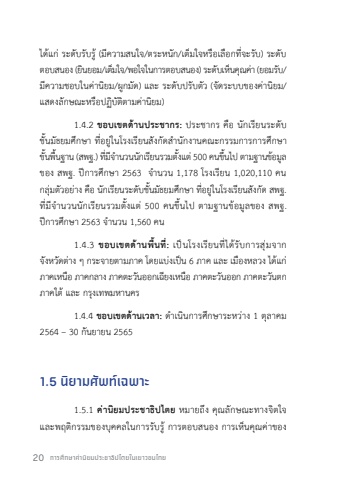 20 %u0e01%u0e32%u0e23%u0e28%u0e36%u0e01%u0e29%u0e32%u0e04%u0e48%u0e32%u0e19%u0e34%u0e22%u0e21%u0e1b%u0e23%u0e30%u0e0a%u0e32%u0e18%u0e34%u0e1b%u0e44%u0e15%u0e22%u0e43%u0e19%u0e40%u0e22%u0e32%u0e27%u0e0a%u0e19%u0e44%u0e17%u0e22%u0e44%u0e14%u0e49%u0e41%u0e01%u0e48 %u0e23%u0e30%u0e14%u0e31%u0e1a%u0e23%u0e31%u0e1a%u0e23%u0e39%u0e49 (%u0e21%u0e35%u0e04%u0e27%u0e32%u0e21%u0e2a%u0e19%u0e43%u0e08/%u0e15%u0e23%u0e30%u0e2b%u0e19%u0e31%u0e01/%u0e40%u0e15%u0e47%u0e21%u0e43%u0e08%u0e2b%u0e23%u0e37%u0e2d%u0e40%u0e25%u0e37%u0e2d%u0e01%u0e17%u0e35%u0e48%u0e08%u0e30%u0e23%u0e31%u0e1a) %u0e23%u0e30%u0e14%u0e31%u0e1a%u0e15%u0e2d%u0e1a%u0e2a%u0e19%u0e2d%u0e07 (%u0e22%u0e34%u0e19%u0e22%u0e2d%u0e21/%u0e40%u0e15%u0e47%u0e21%u0e43%u0e08/%u0e1e%u0e2d%u0e43%u0e08%u0e43%u0e19%u0e01%u0e32%u0e23%u0e15%u0e2d%u0e1a%u0e2a%u0e19%u0e2d%u0e07) %u0e23%u0e30%u0e14%u0e31%u0e1a%u0e40%u0e2b%u0e47%u0e19%u0e04%u0e38%u0e13%u0e04%u0e48%u0e32 (%u0e22%u0e2d%u0e21%u0e23%u0e31%u0e1a/%u0e21%u0e35%u0e04%u0e27%u0e32%u0e21%u0e0a%u0e2d%u0e1a%u0e43%u0e19%u0e04%u0e48%u0e32%u0e19%u0e34%u0e22%u0e21/%u0e1c%u0e39%u0e01%u0e21%u0e31%u0e14) %u0e41%u0e25%u0e30 %u0e23%u0e30%u0e14%u0e31%u0e1a%u0e1b%u0e23%u0e31%u0e1a%u0e15%u0e31%u0e27 (%u0e08%u0e31%u0e14%u0e23%u0e30%u0e1a%u0e1a%u0e02%u0e2d%u0e07%u0e04%u0e48%u0e32%u0e19%u0e34%u0e22%u0e21/%u0e41%u0e2a%u0e14%u0e07%u0e25%u0e31%u0e01%u0e29%u0e13%u0e30%u0e2b%u0e23%u0e37%u0e2d%u0e1b%u0e0f%u0e34%u0e1a%u0e31%u0e15%u0e34%u0e15%u0e32%u0e21%u0e04%u0e48%u0e32%u0e19%u0e34%u0e22%u0e21)1.4.2 %u0e02%u0e2d%u0e1a%u0e40%u0e02%u0e15%u0e14%u0e49%u0e32%u0e19%u0e1b%u0e23%u0e30%u0e0a%u0e32%u0e01%u0e23: %u0e1b%u0e23%u0e30%u0e0a%u0e32%u0e01%u0e23 %u0e04%u0e37%u0e2d %u0e19%u0e31%u0e01%u0e40%u0e23%u0e35%u0e22%u0e19%u0e23%u0e30%u0e14%u0e31%u0e1a%u0e0a%u0e31%u0e49%u0e19%u0e21%u0e31%u0e18%u0e22%u0e21%u0e28%u0e36%u0e01%u0e29%u0e32 %u0e17%u0e35%u0e48%u0e2d%u0e22%u0e39%u0e48%u0e43%u0e19%u0e42%u0e23%u0e07%u0e40%u0e23%u0e35%u0e22%u0e19%u0e2a%u0e31%u0e07%u0e01%u0e31%u0e14%u0e2a%ufffd%u0e33%u0e19%u0e31%u0e01%u0e07%u0e32%u0e19%u0e04%u0e13%u0e30%u0e01%u0e23%u0e23%u0e21%u0e01%u0e32%u0e23%u0e01%u0e32%u0e23%u0e28%u0e36%u0e01%u0e29%u0e32%u0e02%u0e31%u0e49%u0e19%u0e1e%u0e37%u0e49%u0e19%u0e10%u0e32%u0e19 (%u0e2a%u0e1e%u0e10.) %u0e17%u0e35%u0e48%u0e21%u0e35%u0e08%ufffd%u0e33%u0e19%u0e27%u0e19%u0e19%u0e31%u0e01%u0e40%u0e23%u0e35%u0e22%u0e19%u0e23%u0e27%u0e21%u0e15%u0e31%u0e49%u0e07%u0e41%u0e15%u0e48 500 %u0e04%u0e19%u0e02%u0e36%u0e49%u0e19%u0e44%u0e1b %u0e15%u0e32%u0e21%u0e10%u0e32%u0e19%u0e02%u0e49%u0e2d%u0e21%u0e39%u0e25%u0e02%u0e2d%u0e07 %u0e2a%u0e1e%u0e10. %u0e1b%u0e35%u0e01%u0e32%u0e23%u0e28%u0e36%u0e01%u0e29%u0e32 2563 %u0e08%ufffd%u0e33%u0e19%u0e27%u0e19 1,178 %u0e42%u0e23%u0e07%u0e40%u0e23%u0e35%u0e22%u0e19 1,020,110 %u0e04%u0e19 %u0e01%u0e25%u0e38%u0e48%u0e21%u0e15%u0e31%u0e27%u0e2d%u0e22%u0e48%u0e32%u0e07 %u0e04%u0e37%u0e2d %u0e19%u0e31%u0e01%u0e40%u0e23%u0e35%u0e22%u0e19%u0e23%u0e30%u0e14%u0e31%u0e1a%u0e0a%u0e31%u0e49%u0e19%u0e21%u0e31%u0e18%u0e22%u0e21%u0e28%u0e36%u0e01%u0e29%u0e32 %u0e17%u0e35%u0e48%u0e2d%u0e22%u0e39%u0e48%u0e43%u0e19%u0e42%u0e23%u0e07%u0e40%u0e23%u0e35%u0e22%u0e19%u0e2a%u0e31%u0e07%u0e01%u0e31%u0e14 %u0e2a%u0e1e%u0e10. %u0e17%u0e35%u0e48%u0e21%u0e35%u0e08%ufffd%u0e33%u0e19%u0e27%u0e19%u0e19%u0e31%u0e01%u0e40%u0e23%u0e35%u0e22%u0e19%u0e23%u0e27%u0e21%u0e15%u0e31%u0e49%u0e07%u0e41%u0e15%u0e48 500 %u0e04%u0e19%u0e02%u0e36%u0e49%u0e19%u0e44%u0e1b %u0e15%u0e32%u0e21%u0e10%u0e32%u0e19%u0e02%u0e49%u0e2d%u0e21%u0e39%u0e25%u0e02%u0e2d%u0e07 %u0e2a%u0e1e%u0e10. %u0e1b%u0e35%u0e01%u0e32%u0e23%u0e28%u0e36%u0e01%u0e29%u0e32 2563 %u0e08%ufffd%u0e33%u0e19%u0e27%u0e19 1,560 %u0e04%u0e191.4.3 %u0e02%u0e2d%u0e1a%u0e40%u0e02%u0e15%u0e14%u0e49%u0e32%u0e19%u0e1e%u0e37%u0e49%u0e19%u0e17%u0e35%u0e48: %u0e40%u0e1b%u0e47%u0e19%u0e42%u0e23%u0e07%u0e40%u0e23%u0e35%u0e22%u0e19%u0e17%u0e35%u0e48%u0e44%u0e14%u0e49%u0e23%u0e31%u0e1a%u0e01%u0e32%u0e23%u0e2a%u0e38%u0e48%u0e21%u0e08%u0e32%u0e01%u0e08%u0e31%u0e07%u0e2b%u0e27%u0e31%u0e14%u0e15%u0e48%u0e32%u0e07 %u0e46 %u0e01%u0e23%u0e30%u0e08%u0e32%u0e22%u0e15%u0e32%u0e21%u0e20%u0e32%u0e04 %u0e42%u0e14%u0e22%u0e41%u0e1a%u0e48%u0e07%u0e40%u0e1b%u0e47%u0e19 6 %u0e20%u0e32%u0e04 %u0e41%u0e25%u0e30 %u0e40%u0e21%u0e37%u0e2d%u0e07%u0e2b%u0e25%u0e27%u0e07 %u0e44%u0e14%u0e49%u0e41%u0e01%u0e48 %u0e20%u0e32%u0e04%u0e40%u0e2b%u0e19%u0e37%u0e2d %u0e20%u0e32%u0e04%u0e01%u0e25%u0e32%u0e07 %u0e20%u0e32%u0e04%u0e15%u0e30%u0e27%u0e31%u0e19%u0e2d%u0e2d%u0e01%u0e40%u0e09%u0e35%u0e22%u0e07%u0e40%u0e2b%u0e19%u0e37%u0e2d %u0e20%u0e32%u0e04%u0e15%u0e30%u0e27%u0e31%u0e19%u0e2d%u0e2d%u0e01 %u0e20%u0e32%u0e04%u0e15%u0e30%u0e27%u0e31%u0e19%u0e15%u0e01 %u0e20%u0e32%u0e04%u0e43%u0e15%u0e49 %u0e41%u0e25%u0e30 %u0e01%u0e23%u0e38%u0e07%u0e40%u0e17%u0e1e%u0e21%u0e2b%u0e32%u0e19%u0e04%u0e231.4.4 %u0e02%u0e2d%u0e1a%u0e40%u0e02%u0e15%u0e14%u0e49%u0e32%u0e19%u0e40%u0e27%u0e25%u0e32: %u0e14%ufffd%u0e33%u0e40%u0e19%u0e34%u0e19%u0e01%u0e32%u0e23%u0e28%u0e36%u0e01%u0e29%u0e32%u0e23%u0e30%u0e2b%u0e27%u0e48%u0e32%u0e07 1 %u0e15%u0e38%u0e25%u0e32%u0e04%u0e21 2564 %u2013 30 %u0e01%u0e31%u0e19%u0e22%u0e32%u0e22%u0e19 2565 1.5 %u0e19%u0e34%u0e22%u0e32%u0e21%u0e28%u0e31%u0e1e%u0e17%u0e4c%u0e40%u0e09%u0e1e%u0e32%u0e301.5.1 %u0e04%u0e48%u0e32%u0e19%u0e34%u0e22%u0e21%u0e1b%u0e23%u0e30%u0e0a%u0e32%u0e18%u0e34%u0e1b%u0e44%u0e15%u0e22 %u0e2b%u0e21%u0e32%u0e22%u0e16%u0e36%u0e07 %u0e04%u0e38%u0e13%u0e25%u0e31%u0e01%u0e29%u0e13%u0e30%u0e17%u0e32%u0e07%u0e08%u0e34%u0e15%u0e43%u0e08%u0e41%u0e25%u0e30%u0e1e%u0e24%u0e15%u0e34%u0e01%u0e23%u0e23%u0e21%u0e02%u0e2d%u0e07%u0e1a%u0e38%u0e04%u0e04%u0e25%u0e43%u0e19%u0e01%u0e32%u0e23%u0e23%u0e31%u0e1a%u0e23%u0e39%u0e49 %u0e01%u0e32%u0e23%u0e15%u0e2d%u0e1a%u0e2a%u0e19%u0e2d%u0e07 %u0e01%u0e32%u0e23%u0e40%u0e2b%u0e47%u0e19%u0e04%u0e38%u0e13%u0e04%u0e48%u0e32%u0e02%u0e2d%u0e07