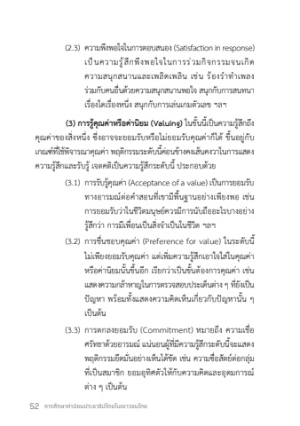 52 %u0e01%u0e32%u0e23%u0e28%u0e36%u0e01%u0e29%u0e32%u0e04%u0e48%u0e32%u0e19%u0e34%u0e22%u0e21%u0e1b%u0e23%u0e30%u0e0a%u0e32%u0e18%u0e34%u0e1b%u0e44%u0e15%u0e22%u0e43%u0e19%u0e40%u0e22%u0e32%u0e27%u0e0a%u0e19%u0e44%u0e17%u0e22(2.3) %u0e04%u0e27%u0e32%u0e21%u0e1e%u0e36%u0e07%u0e1e%u0e2d%u0e43%u0e08%u0e43%u0e19%u0e01%u0e32%u0e23%u0e15%u0e2d%u0e1a%u0e2a%u0e19%u0e2d%u0e07 (Satisfaction in response) %u0e40%u0e1b%u0e47%u0e19%u0e04%u0e27%u0e32%u0e21%u0e23%u0e39%u0e49%u0e2a%u0e36%u0e01%u0e1e%u0e36%u0e07%u0e1e%u0e2d%u0e43%u0e08%u0e43%u0e19%u0e01%u0e32%u0e23%u0e23%u0e48%u0e27%u0e21%u0e01%u0e34%u0e08%u0e01%u0e23%u0e23%u0e21%u0e08%u0e19%u0e40%u0e01%u0e34%u0e14%u0e04%u0e27%u0e32%u0e21%u0e2a%u0e19%u0e38%u0e01%u0e2a%u0e19%u0e32%u0e19%u0e41%u0e25%u0e30%u0e40%u0e1e%u0e25%u0e34%u0e14%u0e40%u0e1e%u0e25%u0e34%u0e19 %u0e40%u0e0a%u0e48%u0e19 %u0e23%u0e49%u0e2d%u0e07%u0e23%u0e4d%u0e32%u0e17%ufffd%u0e33%u0e40%u0e1e%u0e25%u0e07%u0e23%u0e48%u0e27%u0e21%u0e01%u0e31%u0e1a%u0e04%u0e19%u0e2d%u0e37%u0e48%u0e19%u0e14%u0e49%u0e27%u0e22%u0e04%u0e27%u0e32%u0e21%u0e2a%u0e19%u0e38%u0e01%u0e2a%u0e19%u0e32%u0e19%u0e1e%u0e2d%u0e43%u0e08 %u0e2a%u0e19%u0e38%u0e01%u0e01%u0e31%u0e1a%u0e01%u0e32%u0e23%u0e2a%u0e19%u0e17%u0e19%u0e32%u0e40%u0e23%u0e37%u0e48%u0e2d%u0e07%u0e43%u0e14%u0e40%u0e23%u0e37%u0e48%u0e2d%u0e07%u0e2b%u0e19%u0e36%u0e48%u0e07 %u0e2a%u0e19%u0e38%u0e01%u0e01%u0e31%u0e1a%u0e01%u0e32%u0e23%u0e40%u0e25%u0e48%u0e19%u0e40%u0e01%u0e21%u0e15%u0e31%u0e27%u0e40%u0e25%u0e02 %u0e2f%u0e25%u0e2f(3) %u0e01%u0e32%u0e23%u0e23%u0e39%u0e49%u0e04%u0e38%u0e13%u0e04%u0e48%u0e32%u0e2b%u0e23%u0e37%u0e2d%u0e04%u0e48%u0e32%u0e19%u0e34%u0e22%u0e21 (Valuing) %u0e43%u0e19%u0e02%u0e31%u0e49%u0e19%u0e19%u0e35%u0e49%u0e40%u0e1b%u0e47%u0e19%u0e04%u0e27%u0e32%u0e21%u0e23%u0e39%u0e49%u0e2a%u0e36%u0e01%u0e16%u0e36%u0e07%u0e04%u0e38%u0e13%u0e04%u0e48%u0e32%u0e02%u0e2d%u0e07%u0e2a%u0e34%u0e48%u0e07%u0e2b%u0e19%u0e36%u0e48%u0e07 %u0e0b%u0e36%u0e48%u0e07%u0e2d%u0e32%u0e08%u0e08%u0e30%u0e22%u0e2d%u0e21%u0e23%u0e31%u0e1a%u0e2b%u0e23%u0e37%u0e2d%u0e44%u0e21%u0e48%u0e22%u0e2d%u0e21%u0e23%u0e31%u0e1a%u0e04%u0e38%u0e13%u0e04%u0e48%u0e32%u0e01%u0e47%u0e44%u0e14%u0e49 %u0e02%u0e36%u0e49%u0e19%u0e2d%u0e22%u0e39%u0e48%u0e01%u0e31%u0e1a%u0e40%u0e01%u0e13%u0e11%u0e4c%u0e17%u0e35%u0e48%u0e43%u0e0a%u0e49%u0e1e%u0e34%u0e08%u0e32%u0e23%u0e13%u0e32%u0e04%u0e38%u0e13%u0e04%u0e48%u0e32 %u0e1e%u0e24%u0e15%u0e34%u0e01%u0e23%u0e23%u0e21%u0e23%u0e30%u0e14%u0e31%u0e1a%u0e19%u0e35%u0e49%u0e04%u0e48%u0e2d%u0e19%u0e02%u0e49%u0e32%u0e07%u0e04%u0e07%u0e40%u0e2a%u0e49%u0e19%u0e04%u0e07%u0e27%u0e32%u0e43%u0e19%u0e01%u0e32%u0e23%u0e41%u0e2a%u0e14%u0e07%u0e04%u0e27%u0e32%u0e21%u0e23%u0e39%u0e49%u0e2a%u0e36%u0e01%u0e41%u0e25%u0e30%u0e23%u0e31%u0e1a%u0e23%u0e39%u0e49 %u0e40%u0e08%u0e15%u0e04%u0e15%u0e34%u0e40%u0e1b%u0e47%u0e19%u0e04%u0e27%u0e32%u0e21%u0e23%u0e39%u0e49%u0e2a%u0e36%u0e01%u0e23%u0e30%u0e14%u0e31%u0e1a%u0e19%u0e35%u0e49 %u0e1b%u0e23%u0e30%u0e01%u0e2d%u0e1a%u0e14%u0e49%u0e27%u0e22(3.1) %u0e01%u0e32%u0e23%u0e23%u0e31%u0e1a%u0e23%u0e39%u0e49%u0e04%u0e38%u0e13%u0e04%u0e48%u0e32 (Acceptance of a value) %u0e40%u0e1b%u0e47%u0e19%u0e01%u0e32%u0e23%u0e22%u0e2d%u0e21%u0e23%u0e31%u0e1a%u0e17%u0e32%u0e07%u0e2d%u0e32%u0e23%u0e21%u0e13%u0e4c%u0e15%u0e48%u0e2d%u0e04%ufffd%u0e33%u0e2a%u0e2d%u0e19%u0e17%u0e35%u0e48%u0e40%u0e02%u0e32%u0e21%u0e35%u0e1e%u0e37%u0e49%u0e19%u0e10%u0e32%u0e19%u0e2d%u0e22%u0e48%u0e32%u0e07%u0e40%u0e1e%u0e35%u0e22%u0e07%u0e1e%u0e2d %u0e40%u0e0a%u0e48%u0e19 %u0e01%u0e32%u0e23%u0e22%u0e2d%u0e21%u0e23%u0e31%u0e1a%u0e27%u0e48%u0e32%u0e43%u0e19%u0e0a%u0e35%u0e27%u0e34%u0e15%u0e21%u0e19%u0e38%u0e29%u0e22%u0e4c%u0e04%u0e27%u0e23%u0e21%u0e35%u0e01%u0e32%u0e23%u0e19%u0e31%u0e1a%u0e16%u0e37%u0e2d%u0e2d%u0e30%u0e44%u0e23%u0e1a%u0e32%u0e07%u0e2d%u0e22%u0e48%u0e32%u0e07 %u0e23%u0e39%u0e49%u0e2a%u0e36%u0e01%u0e27%u0e48%u0e32 %u0e01%u0e32%u0e23%u0e21%u0e35%u0e40%u0e1e%u0e37%u0e48%u0e2d%u0e19%u0e40%u0e1b%u0e47%u0e19%u0e2a%u0e34%u0e48%u0e07%u0e08%ufffd%u0e33%u0e40%u0e1b%u0e47%u0e19%u0e43%u0e19%u0e0a%u0e35%u0e27%u0e34%u0e15 %u0e2f%u0e25%u0e2f (3.2) %u0e01%u0e32%u0e23%u0e0a%u0e37%u0e48%u0e19%u0e0a%u0e2d%u0e1a%u0e04%u0e38%u0e13%u0e04%u0e48%u0e32 (Preference for value) %u0e43%u0e19%u0e23%u0e30%u0e14%u0e31%u0e1a%u0e19%u0e35%u0e49%u0e44%u0e21%u0e48%u0e40%u0e1e%u0e35%u0e22%u0e07%u0e22%u0e2d%u0e21%u0e23%u0e31%u0e1a%u0e04%u0e38%u0e13%u0e04%u0e48%u0e32 %u0e41%u0e15%u0e48%u0e40%u0e1e%u0e34%u0e48%u0e21%u0e04%u0e27%u0e32%u0e21%u0e23%u0e39%u0e49%u0e2a%u0e36%u0e01%u0e40%u0e2d%u0e32%u0e43%u0e08%u0e43%u0e2a%u0e48%u0e43%u0e19%u0e04%u0e38%u0e13%u0e04%u0e48%u0e32%u0e2b%u0e23%u0e37%u0e2d%u0e04%u0e48%u0e32%u0e19%u0e34%u0e22%u0e21%u0e19%u0e31%u0e49%u0e19%u0e02%u0e36%u0e49%u0e19%u0e2d%u0e35%u0e01 %u0e40%u0e23%u0e35%u0e22%u0e01%u0e27%u0e48%u0e32%u0e40%u0e1b%u0e47%u0e19%u0e02%u0e31%u0e49%u0e19%u0e15%u0e49%u0e2d%u0e07%u0e01%u0e32%u0e23%u0e04%u0e38%u0e13%u0e04%u0e48%u0e32 %u0e40%u0e0a%u0e48%u0e19 %u0e41%u0e2a%u0e14%u0e07%u0e04%u0e27%u0e32%u0e21%u0e01%u0e25%u0e49%u0e32%u0e2b%u0e32%u0e0d%u0e43%u0e19%u0e01%u0e32%u0e23%u0e15%u0e23%u0e27%u0e08%u0e2a%u0e2d%u0e1a%u0e1b%u0e23%u0e30%u0e40%u0e14%u0e47%u0e19%u0e15%u0e48%u0e32%u0e07 %u0e46 %u0e17%u0e35%u0e48%u0e22%u0e31%u0e07%u0e40%u0e1b%u0e47%u0e19%u0e1b%u0e31%u0e0d%u0e2b%u0e32 %u0e1e%u0e23%u0e49%u0e2d%u0e21%u0e17%u0e31%u0e49%u0e07%u0e41%u0e2a%u0e14%u0e07%u0e04%u0e27%u0e32%u0e21%u0e04%u0e34%u0e14%u0e40%u0e2b%u0e47%u0e19%u0e40%u0e01%u0e35%u0e48%u0e22%u0e27%u0e01%u0e31%u0e1a%u0e1b%u0e31%u0e0d%u0e2b%u0e32%u0e19%u0e31%u0e49%u0e19 %u0e46 %u0e40%u0e1b%u0e47%u0e19%u0e15%u0e49%u0e19(3.3) %u0e01%u0e32%u0e23%u0e15%u0e01%u0e25%u0e07%u0e22%u0e2d%u0e21%u0e23%u0e31%u0e1a (Commitment) %u0e2b%u0e21%u0e32%u0e22%u0e16%u0e36%u0e07 %u0e04%u0e27%u0e32%u0e21%u0e40%u0e0a%u0e37%u0e48%u0e2d%u0e28%u0e23%u0e31%u0e17%u0e18%u0e32%u0e14%u0e49%u0e27%u0e22%u0e2d%u0e32%u0e23%u0e21%u0e13%u0e4c %u0e41%u0e19%u0e48%u0e19%u0e2d%u0e19%u0e1c%u0e39%u0e49%u0e17%u0e35%u0e48%u0e21%u0e35%u0e04%u0e27%u0e32%u0e21%u0e23%u0e39%u0e49%u0e2a%u0e36%u0e01%u0e23%u0e30%u0e14%u0e31%u0e1a%u0e19%u0e35%u0e49%u0e08%u0e30%u0e41%u0e2a%u