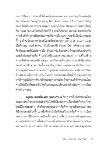 59%u0e1c%u0e25%u0e01%u0e32%u0e23%u0e27%u0e34%u0e08%u0e31%u0e22%u0e1e%u0e1a%u0e27%u0e48%u0e32%u0e02%u0e49%u0e2d%u0e21%u0e39%u0e25%u0e17%u0e31%u0e48%u0e27%u0e44%u0e1b%u0e02%u0e2d%u0e07%u0e1c%u0e39%u0e49%u0e15%u0e2d%u0e1a%u0e41%u0e1a%u0e1a%u0e2a%u0e2d%u0e1a%u0e16%u0e32%u0e21 %u0e2a%u0e48%u0e27%u0e19%u0e43%u0e2b%u0e0d%u0e48%u0e40%u0e1b%u0e47%u0e19%u0e40%u0e1e%u0e28%u0e2b%u0e0d%u0e34%u0e07%u0e04%u0e34%u0e14%u0e40%u0e1b%u0e47%u0e19%u0e23%u0e49%u0e2d%u0e22%u0e25%u0e30 56 %u0e2d%u0e22%u0e39%u0e48%u0e43%u0e19%u0e0a%u0e48%u0e27%u0e07%u0e2d%u0e32%u0e22%u0e3816 %u0e1b%u0e35%u0e04%u0e34%u0e14%u0e40%u0e1b%u0e47%u0e19%u0e23%u0e49%u0e2d%u0e22%u0e25%u0e30 47 %u0e40%u0e22%u0e32%u0e27%u0e0a%u0e19%u0e2a%u0e48%u0e27%u0e19%u0e43%u0e2b%u0e0d%u0e48%u0e2a%u0e31%u0e07%u0e01%u0e31%u0e14%u0e42%u0e23%u0e07%u0e40%u0e23%u0e35%u0e22%u0e19%u0e19%u0e04%u0e23%u0e28%u0e23%u0e35%u0e25%ufffd%u0e33%u0e14%u0e27%u0e19%u0e27%u0e34%u0e17%u0e22%u0e32%u0e04%u0e34%u0e14%u0e40%u0e1b%u0e47%u0e19%u0e23%u0e49%u0e2d%u0e22%u0e25%u0e30 48%u0e41%u0e25%u0e30%u0e40%u0e22%u0e32%u0e27%u0e0a%u0e19%u0e2a%u0e48%u0e27%u0e19%u0e43%u0e2b%u0e0d%u0e48%u0e28%u0e36%u0e01%u0e29%u0e32%u0e23%u0e30%u0e14%u0e31%u0e1a%u0e0a%u0e31%u0e49%u0e19%u0e23%u0e30%u0e14%u0e31%u0e1a%u0e21%u0e31%u0e18%u0e22%u0e21%u0e28%u0e36%u0e01%u0e29%u0e32%u0e1b%u0e35%u0e17%u0e35%u0e484%u0e04%u0e34%u0e14%u0e40%u0e1b%u0e47%u0e19%u0e23%u0e49%u0e2d%u0e22%u0e25%u0e30 48 %u0e23%u0e30%u0e14%u0e31%u0e1a%u0e04%u0e27%u0e32%u0e21%u0e04%u0e34%u0e14%u0e40%u0e2b%u0e47%u0e19%u0e04%u0e27%u0e32%u0e21%u0e15%u0e37%u0e48%u0e19%u0e15%u0e31%u0e27%u0e17%u0e32%u0e07%u0e01%u0e32%u0e23%u0e40%u0e21%u0e37%u0e2d%u0e07%u0e02%u0e2d%u0e07%u0e40%u0e22%u0e32%u0e27%u0e0a%u0e19%u0e43%u0e19%u0e01%u0e32%u0e23%u0e40%u0e21%u0e37%u0e2d%u0e07%u0e41%u0e1a%u0e1a %u0e1b%u0e23%u0e30%u0e0a%u0e32%u0e18%u0e34%u0e1b%u0e44%u0e15%u0e22%u0e43%u0e19%u0e20%u0e32%u0e1e%u0e23%u0e27%u0e21%u0e17%u0e31%u0e49%u0e07 5 %u0e14%u0e49%u0e32%u0e19 %u0e42%u0e14%u0e22%u0e20%u0e32%u0e1e%u0e23%u0e27%u0e21%u0e2d%u0e22%u0e39 %u0e48%u0e43%u0e19%u0e23%u0e30%u0e14%u0e31%u0e1a%u0e1b%u0e32%u0e19%u0e01%u0e25%u0e32%u0e07 (x%u0305= 3.15, S.D.= 0.92)%u0e40%u0e21%u0e37%u0e48%u0e2d%u0e1e%u0e34%u0e08%u0e32%u0e23%u0e13%u0e32%u0e23%u0e32%u0e22%u0e14%u0e49%u0e32%u0e19 %u0e1e%u0e1a%u0e27%u0e48%u0e32%u0e2d%u0e31%u0e19%u0e14%u0e31%u0e1a%u0e41%u0e23%u0e01%u0e04%u0e37%u0e2d%u0e14%u0e49%u0e32%u0e19%u0e2a%u0e16%u0e32%u0e1a%u0e31%u0e19%u0e01%u0e32%u0e23%u0e28%u0e36%u0e01%u0e29%u0e32 %u0e23%u0e2d%u0e07%u0e25%u0e07%u0e21%u0e32%u0e04%u0e37%u0e2d%u0e14%u0e49%u0e32%u0e19%u0e04%u0e27%u0e32%u0e21%u0e40%u0e02%u0e49%u0e32%u0e43%u0e08%u0e17%u0e32%u0e07%u0e01%u0e32%u0e23%u0e40%u0e21%u0e37%u0e2d%u0e07%u0e14%u0e49%u0e32%u0e19%u0e2a%u0e16%u0e32%u0e1a%u0e31%u0e19 %u0e2a%u0e37%u0e48%u0e2d%u0e21%u0e27%u0e25%u0e0a%u0e19 %u0e14%u0e49%u0e32%u0e19%u0e2a%u0e16%u0e32%u0e1a%u0e31%u0e19%u0e04%u0e23%u0e2d%u0e1a%u0e04%u0e23%u0e31%u0e27%u0e41%u0e25%u0e30%u0e25%ufffd%u0e33%u0e14%u0e31%u0e1a%u0e2a%u0e38%u0e14%u0e17%u0e49%u0e32%u0e22%u0e04%u0e37%u0e2d %u0e14%u0e49%u0e32%u0e19%u0e01%u0e25%u0e38%u0e48%u0e21%u0e40%u0e1e%u0e37%u0e48%u0e2d%u0e19%u0e41%u0e25%u0e30%u0e0a%u0e38%u0e21%u0e0a%u0e19 %u0e41%u0e19%u0e27%u0e17%u0e32%u0e07%u0e01%u0e32%u0e23%u0e40%u0e2a%u0e23%u0e34%u0e21%u0e2a%u0e23%u0e49%u0e32%u0e07%u0e04%u0e27%u0e32%u0e21%u0e15%u0e37%u0e48%u0e19%u0e15%u0e31%u0e27%u0e17%u0e32%u0e07%u0e01%u0e32%u0e23%u0e40%u0e21%u0e37%u0e2d%u0e07%u0e02%u0e2d%u0e07%u0e40%u0e22%u0e32%u0e27%u0e0a%u0e19%u0e43%u0e19%u0e01%u0e32%u0e23%u0e40%u0e21%u0e37%u0e2d%u0e07%u0e41%u0e1a%u0e1a%u0e1b%u0e23%u0e30%u0e0a%u0e32%u0e18%u0e34%u0e1b%u0e44%u0e15%u0e22%u0e14%u0e49%u0e32%u0e19%u0e2a%u0e16%u0e32%u0e1a%u0e31%u0e19%u0e01%u0e32%u0e23%u0e28%u0e36%u0e01%u0e29%u0e32 %u0e04%u0e27%u0e23%u0e08%u0e31%u0e14%u0e15%u0e31%u0e49%u0e07%u0e41%u0e2b%u0e25%u0e48%u0e07%u0e40%u0e23%u0e35%u0e22%u0e19%u0e23%u0e39%u0e49%u0e40%u0e1e%u0e37%u0e48%u0e2d%u0e16%u0e48%u0e32%u0e22%u0e17%u0e2d%u0e14%u0e04%u0e27%u0e32%u0e21%u0e23%u0e39%u0e49%u0e43%u0e2b%u0e49%u0e01%u0e31%u0e1a%u0e40%u0e22%u0e32%u0e27%u0e0a%u0e19%u0e14%u0e49%u0e32%u0e19%u0e01%u0e25%u0e38%u0e48%u0e21%u0e40%u0e1e%u0e37%u0e48%u0e2d%u0e19%u0e41%u0e25%u0e30%u0e0a%u0e38%u0e21%u0e0a%u0e19%u0e04%u0e27%u0e23%u0e21%u0e35%u0e01%u0e32%u0e23%u0e1e%u0e39%u0e14%u0e04%u0e38%u0e22%u0e41%u0e25%u0e30%u0e21%u0e35%u0e2a%u0e48%u0e27%u0e19%u0e23%u0e48%u0e27%u0e21%u0e41%u0e1a%u0e1a%u0e27%u0e34%u0e16%u0e35%u0e1b%u0e23%u0e30%u0e0a%u0e32%u0e18%u0e34%u0e1b%u0e44%u0e15%u0e22%u0e14%u0e49%u0e32%u0e19%u0e2a%u0e16%u0e32%u0e1a%u0e31%u0e19%u0e2a%u0e37%u0e48%u0e2d%u0e21%u0e27%u0e25%u0e0a%u0e19%u0e04%u0e27%u0e23%u0e40%u0e19%u0e49%u0e19%u0e01%u0e32%u0e23%u0e1b%u0e23%u0e30%u0e0a%u0e32%u0e2a%u0e31%u0e21%u0e1e%u0e31%u0e19%u0e18%u0e4c%u0e43%u0e2b%u0e49%u0e40%u0e02%u0e49%u0e32%u0e16%u0e36%u0e07%u0e01%u0e25%u0e38%u0e48%u0e21%u0e40%u0e22%u0e32%u0e27%u0e0a%u0e19%u0e2b%u0e32%u0e27%u0e34%u0e18%u0e35%u0e01%u0e32%u0e23%u0e08%u0e39%u0e07%u0e43%u0e08%u0e43%u0e19%u0e01%u0e32%u0e23%u0e40%u0e02%u0e49%u0e32%u0e21%u0e32%u0e21%u0e35%u0e2a%u0e48%u0e27%u0e19%u0e23%u0e48%u0e27%u0e21%u0e17%u0e32%u0e07%u0e01%u0e32%u0e23%u0e40%u0e21%u0e37%u0e2d%u0e07%u0e14%u0e49%u0e32%u0e19%u0e04%u0e27%u0e32%u0e21%u0e40%u0e02%u0e49%u0e32%u0e43%u0e08%u0e17%u0e32%u0e07%u0e01%u0e32%u0e23%u0e40%u0e21%u0e37%u0e2d%u0e07%u0e04%u0e27%u0e23%u0e08%u0e31%u0e14%u0e43%u0e2b%u0e49%u0e21%u0e35%u0e40%u0e27%u0e17%u0e35%u0e1b%u0e23%u0e30%u0e0a%u0e32%u0e18%u0e34%u0e1b%u0e44%u0e15%u0e22%u0e43%u0e19%u0e01%u0e32%u0e23%u0e41%u0e25%u0e01%u0e40%u0e1b%u0e25%u0e35%u0e48%u0e22%u0e19%u0e04%u0e27%u0e32%u0e21%u0e04%u0e34%u0e14%u0e40%u0e2b%u0e47%u0e19%u0e17%u0e32%u0e07%u0e01%u0e32%u0e23%u0e40%u0e21%u0e37%u0e2d%u0e07%u0e2a%ufffd%u0e33%u0e2b%u0e23%u0e31%u0e1a%u0e40%u0e22%u0e32%u0e27%u0e0a%u0e19%u0e13%u0e10%u0e21%u0e19 %u0e2b%u0e21%u0e27%u0e01%u0e09%u0e34%u0e21 %u0e41%u0e25%u0e30 %u0e04%u0e13%u0e30 (2565)%u0e28%u0e36%u0e01%u0e29%u0e32%u0e01%u0e32%u0e23%u0e15%u0e37%u0e48%u0e19%u0e15%u0e31%u0e27%u0e17%u0e32%u0e07%u0e01%u0e32%u0e23%u0e40%u0e21%u0e37%u0e2d%u0e07%u0e02%u0e2d%u0e07%u0e40%u0e22%u0e32%u0e27%u0e0a%u0e19%u0e43%u0e1