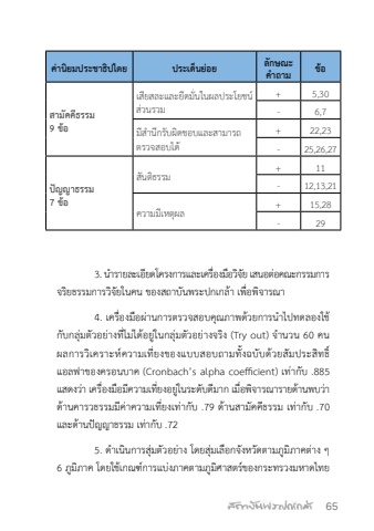 65%u0e04%u0e48%u0e32%u0e19%u0e34%u0e22%u0e21%u0e1b%u0e23%u0e30%u0e0a%u0e32%u0e18%u0e34%u0e1b%u0e44%u0e15%u0e22 %u0e1b%u0e23%u0e30%u0e40%u0e14%u0e47%u0e19%u0e22%u0e48%u0e2d%u0e22 %u0e25%u0e31%u0e01%u0e29%u0e13%u0e30%u0e04%ufffd%u0e33%u0e16%u0e32%u0e21%u0e02%u0e49%u0e2d%u0e2a%u0e32%u0e21%u0e31%u0e04%u0e04%u0e35%u0e18%u0e23%u0e23%u0e219 %u0e02%u0e49%u0e2d%u0e40%u0e2a%u0e35%u0e22%u0e2a%u0e25%u0e30%u0e41%u0e25%u0e30%u0e22%u0e36%u0e14%u0e21%u0e31%u0e48%u0e19%u0e43%u0e19%u0e1c%u0e25%u0e1b%u0e23%u0e30%u0e42%u0e22%u0e0a%u0e19%u0e4c%u0e2a%u0e48%u0e27%u0e19%u0e23%u0e27%u0e21+ 5,30- 6,7%u0e21%u0e35%u0e2a%ufffd%u0e33%u0e19%u0e36%u0e01%u0e23%u0e31%u0e1a%u0e1c%u0e34%u0e14%u0e0a%u0e2d%u0e1a%u0e41%u0e25%u0e30%u0e2a%u0e32%u0e21%u0e32%u0e23%u0e16%u0e15%u0e23%u0e27%u0e08%u0e2a%u0e2d%u0e1a%u0e44%u0e14%u0e49+ 22,23- 25,26,27%u0e1b%u0e31%u0e0d%u0e0d%u0e32%u0e18%u0e23%u0e23%u0e217 %u0e02%u0e49%u0e2d%u0e2a%u0e31%u0e19%u0e15%u0e34%u0e18%u0e23%u0e23%u0e21+ 11- 12,13,21%u0e04%u0e27%u0e32%u0e21%u0e21%u0e35%u0e40%u0e2b%u0e15%u0e38%u0e1c%u0e25+ 15,28- 293. %u0e19%ufffd%u0e33%u0e23%u0e32%u0e22%u0e25%u0e30%u0e40%u0e2d%u0e35%u0e22%u0e14%u0e42%u0e04%u0e23%u0e07%u0e01%u0e32%u0e23%u0e41%u0e25%u0e30%u0e40%u0e04%u0e23%u0e37%u0e48%u0e2d%u0e07%u0e21%u0e37%u0e2d%u0e27%u0e34%u0e08%u0e31%u0e22 %u0e40%u0e2a%u0e19%u0e2d%u0e15%u0e48%u0e2d%u0e04%u0e13%u0e30%u0e01%u0e23%u0e23%u0e21%u0e01%u0e32%u0e23%u0e08%u0e23%u0e34%u0e22%u0e18%u0e23%u0e23%u0e21%u0e01%u0e32%u0e23%u0e27%u0e34%u0e08%u0e31%u0e22%u0e43%u0e19%u0e04%u0e19 %u0e02%u0e2d%u0e07%u0e2a%u0e16%u0e32%u0e1a%u0e31%u0e19%u0e1e%u0e23%u0e30%u0e1b%u0e01%u0e40%u0e01%u0e25%u0e49%u0e32 %u0e40%u0e1e%u0e37%u0e48%u0e2d%u0e1e%u0e34%u0e08%u0e32%u0e23%u0e13%u0e324. %u0e40%u0e04%u0e23%u0e37%u0e48%u0e2d%u0e07%u0e21%u0e37%u0e2d%u0e1c%u0e48%u0e32%u0e19%u0e01%u0e32%u0e23%u0e15%u0e23%u0e27%u0e08%u0e2a%u0e2d%u0e1a%u0e04%u0e38%u0e13%u0e20%u0e32%u0e1e%u0e14%u0e49%u0e27%u0e22%u0e01%u0e32%u0e23%u0e19%ufffd%u0e33%u0e44%u0e1b%u0e17%u0e14%u0e25%u0e2d%u0e07%u0e43%u0e0a%u0e49%u0e01%u0e31%u0e1a%u0e01%u0e25%u0e38%u0e48%u0e21%u0e15%u0e31%u0e27%u0e2d%u0e22%u0e48%u0e32%u0e07%u0e17%u0e35%u0e48%u0e44%u0e21%u0e48%u0e44%u0e14%u0e49%u0e2d%u0e22%u0e39%u0e48%u0e43%u0e19%u0e01%u0e25%u0e38%u0e48%u0e21%u0e15%u0e31%u0e27%u0e2d%u0e22%u0e48%u0e32%u0e07%u0e08%u0e23%u0e34%u0e07 (Try out) %u0e08%ufffd%u0e33%u0e19%u0e27%u0e19 60 %u0e04%u0e19 %u0e1c%u0e25%u0e01%u0e32%u0e23%u0e27%u0e34%u0e40%u0e04%u0e23%u0e32%u0e30%u0e2b%u0e4c%u0e04%u0e27%u0e32%u0e21%u0e40%u0e17%u0e35%u0e48%u0e22%u0e07%u0e02%u0e2d%u0e07%u0e41%u0e1a%u0e1a%u0e2a%u0e2d%u0e1a%u0e16%u0e32%u0e21%u0e17%u0e31%u0e49%u0e07%u0e09%u0e1a%u0e31%u0e1a%u0e14%u0e49%u0e27%u0e22%u0e2a%u0e31%u0e21%u0e1b%u0e23%u0e30%u0e2a%u0e34%u0e17%u0e18%u0e34%u0e4c%u0e41%u0e2d%u0e25%u0e1f%u0e32%u0e02%u0e2d%u0e07%u0e04%u0e23%u0e2d%u0e19%u0e1a%u0e32%u0e04 (Cronbach%u2019s alpha coefficient) %u0e40%u0e17%u0e48%u0e32%u0e01%u0e31%u0e1a .885 %u0e41%u0e2a%u0e14%u0e07%u0e27%u0e48%u0e32 %u0e40%u0e04%u0e23%u0e37%u0e48%u0e2d%u0e07%u0e21%u0e37%u0e2d%u0e21%u0e35%u0e04%u0e27%u0e32%u0e21%u0e40%u0e17%u0e35%u0e48%u0e22%u0e07%u0e2d%u0e22%u0e39%u0e48%u0e43%u0e19%u0e23%u0e30%u0e14%u0e31%u0e1a%u0e14%u0e35%u0e21%u0e32%u0e01 %u0e40%u0e21%u0e37%u0e48%u0e2d%u0e1e%u0e34%u0e08%u0e32%u0e23%u0e13%u0e32%u0e23%u0e32%u0e22%u0e14%u0e49%u0e32%u0e19%u0e1e%u0e1a%u0e27%u0e48%u0e32 %u0e14%u0e49%u0e32%u0e19%u0e04%u0e32%u0e23%u0e27%u0e18%u0e23%u0e23%u0e21%u0e21%u0e35%u0e04%u0e48%u0e32%u0e04%u0e27%u0e32%u0e21%u0e40%u0e17%u0e35%u0e48%u0e22%u0e07%u0e40%u0e17%u0e48%u0e32%u0e01%u0e31%u0e1a .79 %u0e14%u0e49%u0e32%u0e19%u0e2a%u0e32%u0e21%u0e31%u0e04%u0e04%u0e35%u0e18%u0e23%u0e23%u0e21 %u0e40%u0e17%u0e48%u0e32%u0e01%u0e31%u0e1a .70 %u0e41%u0e25%u0e30%u0e14%u0e49%u0e32%u0e19%u0e1b%u0e31%u0e0d%u0e0d%u0e32%u0e18%u0e23%u0e23%u0e21 %u0e40%u0e17%u0e48%u0e32%u0e01%u0e31%u0e1a .725. %u0e14%ufffd%u0e33%u0e40%u0e19%u0e34%u0e19%u0e01%u0e32%u0e23%u0e2a%u0e38%u0e48%u0e21%u0e15%u0e31%u0e27%u0e2d%u0e22%u0e48%u0e32%u0e07 %u0e42%u0e14%u0e22%u0e2a%u0e38%u0e48%u0e21%u0e40%u0e25%u0e37%u0e2d%u0e01%u0e08%u0e31%u0e07%u0e2b%u0e27%u0e31%u0e14%u0e15%u0e32%u0e21%u0e20%u0e39%u0e21%u0e34%u0e20%u0e32%u0e04%u0e15%u0e48%u0e32%u0e07 %u0e46 6 %u0e20%u0e39%u0e21%u0e34%u0e20%u0e32%u0e04 %u0e42%u0e14%u0e22%u0e43%u0e0a%u0e49%u0e40%u0e01%u0e13%u0e11%u0e4c%u0e01%u0e32%u0e23%u0e41%u0e1a%u0e48%u0e07%u0e20%u0e32%u0e04%u0e15%u0e32%u0e21%u0e20%u0e39%u0e21%u0e34%u0e28%u0e32%u0e2a%u0e15%u0e23%u0e4c%u0e02%u0e2d%u0e07%u0e01%u0e23%u0e30%u0e17%u0e23%u0e27%u0e07%u0e21%u0e2b%u0e32%u0e14%u0e44%u0e17%u0e22