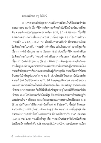 6 %u0e01%u0e32%u0e23%u0e28%u0e36%u0e01%u0e29%u0e32%u0e04%u0e48%u0e32%u0e19%u0e34%u0e22%u0e21%u0e1b%u0e23%u0e30%u0e0a%u0e32%u0e18%u0e34%u0e1b%u0e44%u0e15%u0e22%u0e43%u0e19%u0e40%u0e22%u0e32%u0e27%u0e0a%u0e19%u0e44%u0e17%u0e22%u0e1c%u0e25%u0e01%u0e32%u0e23%u0e28%u0e36%u0e01%u0e29%u0e32 %u0e2a%u0e23%u0e38%u0e1b%u0e44%u0e14%u0e49%u0e14%u0e31%u0e07%u0e19%u0e35%u0e49 (1) %u0e20%u0e32%u0e1e%u0e23%u0e27%u0e21%u0e2a%ufffd%u0e33%u0e04%u0e31%u0e0d%u0e02%u0e2d%u0e07%u0e1b%u0e23%u0e30%u0e40%u0e14%u0e47%u0e19%u0e17%u0e32%u0e07%u0e2a%u0e31%u0e07%u0e04%u0e21%u0e43%u0e19%u0e0a%u0e35%u0e27%u0e34%u0e15%u0e1b%u0e23%u0e30%u0e08%ufffd%u0e33%u0e27%u0e31%u0e19%u0e02%u0e2d%u0e07%u0e40%u0e22%u0e32%u0e27%u0e0a%u0e19 %u0e1e%u0e1a%u0e27%u0e48%u0e32 %u0e40%u0e23%u0e37%u0e48%u0e2d%u0e07%u0e17%u0e35%u0e48%u0e21%u0e35%u0e04%u0e48%u0e32%u0e40%u0e09%u0e25%u0e35%u0e48%u0e22%u0e04%u0e27%u0e32%u0e21%u0e1e%u0e36%u0e07%u0e1e%u0e2d%u0e43%u0e08%u0e43%u0e19%u0e0a%u0e35%u0e27%u0e34%u0e15%u0e1b%u0e31%u0e08%u0e08%u0e38%u0e1a%u0e31%u0e19%u0e21%u0e32%u0e01%u0e17%u0e35%u0e48%u0e2a%u0e38%u0e14 %u0e04%u0e37%u0e2d %u0e04%u0e27%u0e32%u0e21%u0e1e%u0e36%u0e07%u0e1e%u0e2d%u0e43%u0e08%u0e15%u0e48%u0e2d%u0e2a%u0e38%u0e02%u0e20%u0e32%u0e1e (%u0e04%u0e48%u0e32%u0e40%u0e09%u0e25%u0e35%u0e48%u0e22= 8.24, S.D.=1.79) %u0e41%u0e25%u0e30 %u0e40%u0e23%u0e37%u0e48%u0e2d%u0e07%u0e17%u0e35%u0e48%u0e21%u0e35%u0e04%u0e48%u0e32%u0e40%u0e09%u0e25%u0e35%u0e48%u0e22%u0e04%u0e27%u0e32%u0e21%u0e1e%u0e36%u0e07%u0e1e%u0e2d%u0e43%u0e08%u0e43%u0e19%u0e0a%u0e35%u0e27%u0e34%u0e15%u0e1b%u0e31%u0e08%u0e08%u0e38%u0e1a%u0e31%u0e19%u0e19%u0e49%u0e2d%u0e22%u0e17%u0e35%u0e48%u0e2a%u0e38%u0e14 %u0e04%u0e37%u0e2d %u0e40%u0e23%u0e37%u0e48%u0e2d%u0e07%u0e01%u0e32%u0e23%u0e28%u0e36%u0e01%u0e29%u0e32 (%u0e04%u0e48%u0e32%u0e40%u0e09%u0e25%u0e35%u0e48%u0e22 = 7.47, S.D.=1.79) %u0e40%u0e23%u0e37%u0e48%u0e2d%u0e07%u0e17%u0e35%u0e48%u0e40%u0e22%u0e32%u0e27%u0e0a%u0e19%u0e40%u0e2b%u0e47%u0e19%u0e27%u0e48%u0e32 %u0e21%u0e35%u0e04%u0e27%u0e32%u0e21%u0e40%u0e17%u0e48%u0e32%u0e40%u0e17%u0e35%u0e22%u0e21%u0e43%u0e19%u0e2a%u0e31%u0e07%u0e04%u0e21%u0e44%u0e17%u0e22 %u0e43%u0e19%u0e23%u0e30%u0e14%u0e31%u0e1a %u201c%u0e04%u0e48%u0e2d%u0e19%u0e02%u0e49%u0e32%u0e07%u0e40%u0e17%u0e48%u0e32%u0e40%u0e17%u0e35%u0e22%u0e21-%u0e40%u0e17%u0e48%u0e32%u0e40%u0e17%u0e35%u0e22%u0e21%u0e21%u0e32%u0e01%u201d %u0e21%u0e32%u0e01%u0e17%u0e35%u0e48%u0e2a%u0e38%u0e14 %u0e04%u0e37%u0e2d %u0e40%u0e23%u0e37%u0e48%u0e2d%u0e07 %u0e01%u0e32%u0e23%u0e40%u0e02%u0e49%u0e32%u0e16%u0e36%u0e07%u0e02%u0e49%u0e2d%u0e21%u0e39%u0e25%u0e02%u0e48%u0e32%u0e27%u0e2a%u0e32%u0e23 (%u0e23%u0e49%u0e2d%u0e22%u0e25%u0e30 48.5) %u0e2a%u0e48%u0e27%u0e19%u0e40%u0e23%u0e37%u0e48%u0e2d%u0e07%u0e17%u0e35%u0e48%u0e21%u0e35%u0e04%u0e27%u0e32%u0e21%u0e40%u0e17%u0e48%u0e32%u0e40%u0e17%u0e35%u0e22%u0e21%u0e43%u0e19%u0e2a%u0e31%u0e07%u0e04%u0e21%u0e44%u0e17%u0e22 %u0e43%u0e19%u0e23%u0e30%u0e14%u0e31%u0e1a %u201c%u0e04%u0e48%u0e2d%u0e19%u0e02%u0e49%u0e32%u0e07%u0e40%u0e17%u0e48%u0e32%u0e40%u0e17%u0e35%u0e22%u0e21-%u0e40%u0e17%u0e48%u0e32%u0e40%u0e17%u0e35%u0e22%u0e21%u0e21%u0e32%u0e01%u201d %u0e19%u0e49%u0e2d%u0e22%u0e17%u0e35%u0e48%u0e2a%u0e38%u0e14 %u0e04%u0e37%u0e2d %u0e40%u0e23%u0e37%u0e48%u0e2d%u0e07 %u0e01%u0e32%u0e23%u0e1a%u0e31%u0e07%u0e04%u0e31%u0e1a%u0e43%u0e0a%u0e49%u0e01%u0e0e%u0e2b%u0e21%u0e32%u0e22 (%u0e23%u0e49%u0e2d%u0e22%u0e25%u0e30 28.6) %u0e1b%u0e23%u0e30%u0e40%u0e14%u0e47%u0e19%u0e2b%u0e0d%u0e34%u0e07%u0e41%u0e25%u0e30%u0e0a%u0e32%u0e22%u0e43%u0e19%u0e2a%u0e31%u0e07%u0e04%u0e21 %u0e2a%u0e48%u0e27%u0e19%u0e43%u0e2b%u0e0d%u0e48%u0e21%u0e2d%u0e07%u0e27%u0e48%u0e32 %u0e2b%u0e0d%u0e34%u0e07%u0e41%u0e25%u0e30%u0e0a%u0e32%u0e22%u0e21%u0e35%u0e04%u0e27%u0e32%u0e21%u0e40%u0e17%u0e48%u0e32%u0e40%u0e17%u0e35%u0e22%u0e21%u0e01%u0e31%u0e19%u0e43%u0e19%u0e01%u0e32%u0e23%u0e40%u0e1b%u0e47%u0e19%u0e1c%u0e39%u0e49%u0e19%ufffd%u0e33%u0e17%u0e32%u0e07%u0e01%u0e32%u0e23%u0e40%u0e21%u0e37%u0e2d%u0e07 %u0e04%u0e27%u0e32%u0e21%u0e2a%ufffd%u0e33%u0e04%u0e31%u0e0d%u0e02%u0e2d%u0e07%u0e01%u0e32%u0e23%u0e28%u0e36%u0e01%u0e29%u0e32 %u0e41%u0e25%u0e30 %u0e01%u0e32%u0e23%u0e40%u0e1b%u0e47%u0e19%u0e1c%u0e39%u0e49%u0e1a%u0e23%u0e34%u0e2b%u0e32%u0e23%u0e18%u0e38%u0e23%u0e01%u0e34%u0e08 %u0e04%u0e27%u0e32%u0e21%u0e16%u0e35%u0e48%u0e43%u0e19%u0e01%u0e32%u0e23%u0e43%u0e0a%u0e49%u0e07%u0e32%u0e19%u0e2d%u0e34%u0e19%u0e40%u0e17%u0e2d%u0e23%u0e4c%u0e40%u0e19%u0e47%u0e15%u0e43%u0e19%u0e23%u0e39%u0e1b%u0e41%u0e1a%u0e1a%u0e15%u0e48%u0e32%u0e07 %u0e46 %u0e1e%u0e1a%u0e27%u0e48%u0e32 %u0e2a%u0e48%u0e27%u0e19%u0e43%u0e2b%u0e0d%u0e48%u0e43%u0e0a%u0e49%u0e2d%u0e34%u0e19%u0e40%u0e17%u0e2d%u0e23%u0e4c%u0e40%u0e19%u0e47%u0e15%u0e43%u0e19%u0e23%u0e30%u0e14%u0e31%u0e1a%u0e04%u0e27%u0e32%u0e21%u0e16%u0e35%u0e48 5-6 %u0e27%u0e31%u0e19/%u0e2a%u0e31%u0e1b%u0e14%u0e32%u0e2b%u0e4c %u2013 %u0e17%u0e38%u0e01%u0e27%u0e31%u0e19 %u0e44%u0e1b%u0e40%u0e1e%u0e37%u0e48%u0e2d%u0e1e%u0e39%u0e14%u0e04%u0e38%u0e22/%u0e15%u0e34%u0e14%u0e15%u0e32%u0e21%u0e04%u0e27%u0e32%u0e21%u0e40%u0e04%u0e25%u0e37%u0e48%u0e2d%u0e19%u0e44%u0e2b%u0e27%u0e41%u0e25%u0e30%u0e01%u0e34%u0e08%u0e01%u0e23%u0e23%u0e21%u0e02%u0e2d%u0e07%u0e40%u0e1e%u0e37%u0e48%u0e2d%u0e19%u0e17%u0e35%u0e48%u0e42%u0e1e%u0e2a%u0e15%u0e4c%u0e43%u0e19%u0e2a%u0e37%u0e48%u0e2d%u0e2a%u0e31%u0e07%u0e04%u0e21%u0e2d%u0e2d%u0e19%u0e44%u0e25%u0e19%u0e4c %u0e40%u0e0a%u0e48%u0e19 %u0e40%u0e1f%u0e0b%u0e1a%u0e38%u0e4a%u0e01 %u0e2d%u0e34%u0e19%u0e2a%u0e15%u0e32%u0e41%u0e01%u0e23%u0e21 (%u0e23%u0e49%u0e2d%u0e22%u0e25%u0e30 87.2) %u0e23%u0e2d%u0e07%u0e25%u0e07%u0e21%u0e32 %u0e04%u0e37%u0e2d %u0e43%u0e0a%u0e49%u0e40%u0e1e%u0e37%u0e48%u0e2d%u0e2a%u0e37%u0e1a%u0e04%u0e49%u0e19%u0e02%u0e49%u0e2d%u0e21%u0e39%u0e25%u0e15%u0e48%u0e32%u0e07 %u0e46 %u0e43%u0e19%u0e01%u0e32%u0e23%u0e43%u0e0a%u0e49%u0e0a%u0e35%u0e27%u0e34%u0e15%u0e1b%u0e23%u0e30%u0e08%ufffd%u0e33%u0e27%u0e31%u0e19 (%u0e23%u0e49%u0e2d%u0e22%u0e25%u0e30 76.7) %u0e42%u0e14%u0e22%u0e01%u0e34%u0e08%u0e01%u0e23%u0e23%u0e21%u0e17%u0e35%u0e48%u0e17%ufffd%u0e33%u0e19%u0e49%u0e2d%u0e22%u0e17%u0e35%u0e48%u0e2a%u0e38%u0e14 %u