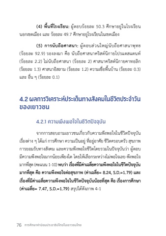 76 %u0e01%u0e32%u0e23%u0e28%u0e36%u0e01%u0e29%u0e32%u0e04%u0e48%u0e32%u0e19%u0e34%u0e22%u0e21%u0e1b%u0e23%u0e30%u0e0a%u0e32%u0e18%u0e34%u0e1b%u0e44%u0e15%u0e22%u0e43%u0e19%u0e40%u0e22%u0e32%u0e27%u0e0a%u0e19%u0e44%u0e17%u0e22(4) %u0e1e%u0e37%u0e49%u0e19%u0e17%u0e35%u0e48%u0e42%u0e23%u0e07%u0e40%u0e23%u0e35%u0e22%u0e19: %u0e1c%u0e39%u0e49%u0e15%u0e2d%u0e1a%u0e23%u0e49%u0e2d%u0e22%u0e25%u0e30 50.3 %u0e28%u0e36%u0e01%u0e29%u0e32%u0e2d%u0e22%u0e39%u0e48%u0e43%u0e19%u0e42%u0e23%u0e07%u0e40%u0e23%u0e35%u0e22%u0e19%u0e19%u0e2d%u0e01%u0e40%u0e02%u0e15%u0e40%u0e21%u0e37%u0e2d%u0e07 %u0e41%u0e25%u0e30 %u0e23%u0e49%u0e2d%u0e22%u0e25%u0e30 49.7 %u0e28%u0e36%u0e01%u0e29%u0e32%u0e2d%u0e22%u0e39%u0e48%u0e42%u0e23%u0e07%u0e40%u0e23%u0e35%u0e22%u0e19%u0e43%u0e19%u0e40%u0e02%u0e15%u0e40%u0e21%u0e37%u0e2d%u0e07(5) %u0e01%u0e32%u0e23%u0e19%u0e31%u0e1a%u0e16%u0e37%u0e2d%u0e28%u0e32%u0e2a%u0e19%u0e32: %u0e1c%u0e39%u0e49%u0e15%u0e2d%u0e1a%u0e2a%u0e48%u0e27%u0e19%u0e43%u0e2b%u0e0d%u0e48%u0e19%u0e31%u0e1a%u0e16%u0e37%u0e2d%u0e28%u0e32%u0e2a%u0e19%u0e32%u0e1e%u0e38%u0e17%u0e18 (%u0e23%u0e49%u0e2d%u0e22%u0e25%u0e30 92.9) %u0e23%u0e2d%u0e07%u0e25%u0e07%u0e21%u0e32 %u0e04%u0e37%u0e2d %u0e19%u0e31%u0e1a%u0e16%u0e37%u0e2d%u0e28%u0e32%u0e2a%u0e19%u0e32%u0e04%u0e23%u0e34%u0e2a%u0e15%u0e4c%u0e19%u0e34%u0e01%u0e32%u0e22%u0e42%u0e1b%u0e23%u0e41%u0e15%u0e2a%u0e41%u0e15%u0e19%u0e17%u0e4c (%u0e23%u0e49%u0e2d%u0e22%u0e25%u0e30 2.2) %u0e44%u0e21%u0e48%u0e19%u0e31%u0e1a%u0e16%u0e37%u0e2d%u0e28%u0e32%u0e2a%u0e19%u0e32 (%u0e23%u0e49%u0e2d%u0e22%u0e25%u0e30 2) %u0e28%u0e32%u0e2a%u0e19%u0e32%u0e04%u0e23%u0e34%u0e2a%u0e15%u0e4c%u0e19%u0e34%u0e01%u0e32%u0e22%u0e04%u0e32%u0e17%u0e2d%u0e25%u0e34%u0e01 (%u0e23%u0e49%u0e2d%u0e22%u0e25%u0e30 1.3) %u0e28%u0e32%u0e2a%u0e19%u0e32%u0e2d%u0e34%u0e2a%u0e25%u0e32%u0e21 (%u0e23%u0e49%u0e2d%u0e22%u0e25%u0e30 1.2) %u0e04%u0e27%u0e32%u0e21%u0e40%u0e0a%u0e37%u0e48%u0e2d%u0e1e%u0e37%u0e49%u0e19%u0e1a%u0e49%u0e32%u0e19 (%u0e23%u0e49%u0e2d%u0e22%u0e25%u0e30 0.3) %u0e41%u0e25%u0e30 %u0e2d%u0e37%u0e48%u0e19 %u0e46 (%u0e23%u0e49%u0e2d%u0e22%u0e25%u0e30 0.1)4.2 %u0e1c%u0e25%u0e01%u0e32%u0e23%u0e27%u0e34%u0e40%u0e04%u0e23%u0e32%u0e30%u0e2b%u0e4c%u0e1b%u0e23%u0e30%u0e40%u0e14%u0e47%u0e19%u0e17%u0e32%u0e07%u0e2a%u0e31%u0e07%u0e04%u0e21%u0e43%u0e19%u0e0a%u0e35%u0e27%u0e34%u0e15%u0e1b%u0e23%u0e30%u0e08%ufffd%u0e32%u0e27%u0e31%u0e19%u0e02%u0e2d%u0e07%u0e40%u0e22%u0e32%u0e27%u0e0a%u0e194.2.1 %u0e04%u0e27%u0e32%u0e21%u0e1e%u0e36%u0e07%u0e1e%u0e2d%u0e43%u0e08%u0e43%u0e19%u0e0a%u0e35%u0e27%u0e34%u0e15%u0e1b%u0e31%u0e08%u0e08%u0e38%u0e1a%u0e31%u0e19%u0e08%u0e32%u0e01%u0e01%u0e32%u0e23%u0e2a%u0e2d%u0e1a%u0e16%u0e32%u0e21%u0e40%u0e22%u0e32%u0e27%u0e0a%u0e19%u0e40%u0e01%u0e35%u0e48%u0e22%u0e27%u0e01%u0e31%u0e1a%u0e04%u0e27%u0e32%u0e21%u0e1e%u0e36%u0e07%u0e1e%u0e2d%u0e43%u0e08%u0e43%u0e19%u0e0a%u0e35%u0e27%u0e34%u0e15%u0e1b%u0e31%u0e08%u0e08%u0e38%u0e1a%u0e31%u0e19%u0e40%u0e23%u0e37%u0e48%u0e2d%u0e07%u0e15%u0e48%u0e32%u0e07 %u0e46 %u0e44%u0e14%u0e49%u0e41%u0e01%u0e48 %u0e01%u0e32%u0e23%u0e28%u0e36%u0e01%u0e29%u0e32 %u0e04%u0e27%u0e32%u0e21%u0e40%u0e1b%u0e47%u0e19%u0e2d%u0e22%u0e39%u0e48 %u0e17%u0e35%u0e48%u0e2d%u0e22%u0e39%u0e48%u0e2d%u0e32%u0e28%u0e31%u0e22 %u0e0a%u0e35%u0e27%u0e34%u0e15%u0e04%u0e23%u0e2d%u0e1a%u0e04%u0e23%u0e31%u0e27 %u0e2a%u0e38%u0e02%u0e20%u0e32%u0e1e %u0e01%u0e32%u0e23%u0e22%u0e2d%u0e21%u0e23%u0e31%u0e1a%u0e17%u0e32%u0e07%u0e2a%u0e31%u0e07%u0e04%u0e21 %u0e41%u0e25%u0e30%u0e04%u0e27%u0e32%u0e21%u0e1e%u0e36%u0e07%u0e1e%u0e2d%u0e43%u0e08%u0e0a%u0e35%u0e27%u0e34%u0e15%u0e42%u0e14%u0e22%u0e23%u0e27%u0e21%u0e43%u0e19%u0e1b%u0e31%u0e08%u0e08%u0e38%u0e1a%u0e31%u0e19%u0e27%u0e48%u0e32 %u0e1c%u0e39%u0e49%u0e15%u0e2d%u0e1a%u0e21%u0e35%u0e04%u0e27%u0e32%u0e21%u0e1e%u0e36%u0e07%u0e1e%u0e2d%u0e43%u0e08%u0e21%u0e32%u0e01%u0e19%u0e49%u0e2d%u0e22%u0e40%u0e1e%u0e35%u0e22%u0e07%u0e43%u0e14 %u0e42%u0e14%u0e22%u0e43%u0e2b%u0e49%u0e40%u0e25%u0e37%u0e2d%u0e01%u0e23%u0e30%u0e2b%u0e27%u0e48%u0e32%u0e07%u0e44%u0e21%u0e48%u0e1e%u0e2d%u0e43%u0e08%u0e40%u0e25%u0e22-%u0e1e%u0e36%u0e07%u0e1e%u0e2d%u0e43%u0e08%u0e21%u0e32%u0e01%u0e17%u0e35%u0e48%u0e2a%u0e38%u0e14 (%u0e04%u0e30%u0e41%u0e19%u0e19 1-10) %u0e1e%u0e1a%u0e27%u0e48%u0e32 %u0e40%u0e23%u0e37%u0e48%u0e2d%u0e07%u0e17%u0e35%u0e48%u0e21%u0e35%u0e04%u0e48%u0e32%u0e40%u0e09%u0e25%u0e35%u0e48%u0e22%u0e04%u0e27%u0e32%u0e21%u0e1e%u0e36%u0e07%u0e1e%u0e2d%u0e43%u0e08%u0e43%u0e19%u0e0a%u0e35%u0e27%u0e34%u0e15%u0e1b%u0e31%u0e08%u0e08%u0e38%u0e1a%u0e31%u0e19%u0e21%u0e32%u0e01%u0e17%u0e35%u0e48%u0e2a%u0e38%u0e14 %u0e04%u0e37%u0e2d %u0e04%u0e27%u0e32%u0e21%u0e1e%u0e36%u0e07%u0e1e%u0e2d%u0e43%u0e08%u0e15%u0e48%u0e2d%u0e2a%u0e38%u0e02%u0e20%u0e32%u0e1e (%u0e04%u0e48%u0e32%u0e40%u0e09%u0e25%u0e35%u0e48%u0e22= 8.24, S.D.=1.79) %u0e41%u0e25%u0e30 %u0e40%u0e23%u0e37%u0e48%u0e2d%u0e07%u0e17%u0e35%u0e48%u0e21%u0e35%u0e04%u0e48%u0e32%u0e40%u0e09%u0e25%u0e35%u0e48%u0e22%u0e04%u0e27%u0e32%u0e21%u0e1e%u0e36%u0e07%u0e1e%u0e2d%u0e43%u0e08%u0e43%u0e19%u0e0a%u0e35%u0e27%u0e34%u0e15%u0e1b%u0e31%u0e08%u0e08%u0e38%u0e1a%u0e31%u0e19%u0e19%u0e49%u0e2d%u0e22%u0e17%u0e35%u0e48%u0e2a%u0e38%u0e14 %u0e04%u0e37%u0e2d %u0e40%u0e23%u0e37%u0e48%u0e2d%u0e07%u0e01%u0e32%u0e23%u0e28%u0e36%u0e01%u0e29%u0e32(%u0e04%u0e48%u0e32%u0e40%u0e09%u0e25%u0e35%u0e48%u0e22= 7.47, S.D.=1.79) %u0e2a%u0e23%u0e38%u0e1b%u0e44%u0e14%u0e49%u0e14%u0e31%u0e07%u0e20%u0e32%u0e1e 4-1