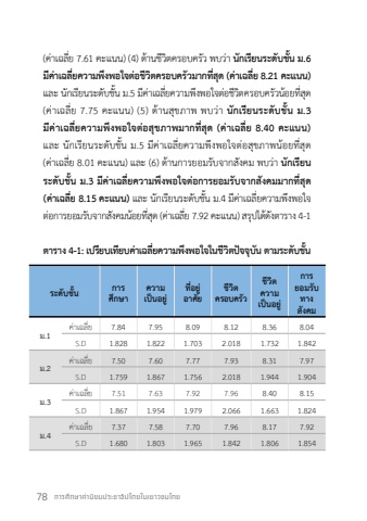 78 %u0e01%u0e32%u0e23%u0e28%u0e36%u0e01%u0e29%u0e32%u0e04%u0e48%u0e32%u0e19%u0e34%u0e22%u0e21%u0e1b%u0e23%u0e30%u0e0a%u0e32%u0e18%u0e34%u0e1b%u0e44%u0e15%u0e22%u0e43%u0e19%u0e40%u0e22%u0e32%u0e27%u0e0a%u0e19%u0e44%u0e17%u0e22(%u0e04%u0e48%u0e32%u0e40%u0e09%u0e25%u0e35%u0e48%u0e22 7.61 %u0e04%u0e30%u0e41%u0e19%u0e19) (4) %u0e14%u0e49%u0e32%u0e19%u0e0a%u0e35%u0e27%u0e34%u0e15%u0e04%u0e23%u0e2d%u0e1a%u0e04%u0e23%u0e31%u0e27 %u0e1e%u0e1a%u0e27%u0e48%u0e32 %u0e19%u0e31%u0e01%u0e40%u0e23%u0e35%u0e22%u0e19%u0e23%u0e30%u0e14%u0e31%u0e1a%u0e0a%u0e31%u0e49%u0e19 %u0e21.6 %u0e21%u0e35%u0e04%u0e48%u0e32%u0e40%u0e09%u0e25%u0e35%u0e48%u0e22%u0e04%u0e27%u0e32%u0e21%u0e1e%u0e36%u0e07%u0e1e%u0e2d%u0e43%u0e08%u0e15%u0e48%u0e2d%u0e0a%u0e35%u0e27%u0e34%u0e15%u0e04%u0e23%u0e2d%u0e1a%u0e04%u0e23%u0e31%u0e27%u0e21%u0e32%u0e01%u0e17%u0e35%u0e48%u0e2a%u0e38%u0e14 (%u0e04%u0e48%u0e32%u0e40%u0e09%u0e25%u0e35%u0e48%u0e22 8.21 %u0e04%u0e30%u0e41%u0e19%u0e19)%u0e41%u0e25%u0e30 %u0e19%u0e31%u0e01%u0e40%u0e23%u0e35%u0e22%u0e19%u0e23%u0e30%u0e14%u0e31%u0e1a%u0e0a%u0e31%u0e49%u0e19 %u0e21.5 %u0e21%u0e35%u0e04%u0e48%u0e32%u0e40%u0e09%u0e25%u0e35%u0e48%u0e22%u0e04%u0e27%u0e32%u0e21%u0e1e%u0e36%u0e07%u0e1e%u0e2d%u0e43%u0e08%u0e15%u0e48%u0e2d%u0e0a%u0e35%u0e27%u0e34%u0e15%u0e04%u0e23%u0e2d%u0e1a%u0e04%u0e23%u0e31%u0e27%u0e19%u0e49%u0e2d%u0e22%u0e17%u0e35%u0e48%u0e2a%u0e38%u0e14 (%u0e04%u0e48%u0e32%u0e40%u0e09%u0e25%u0e35%u0e48%u0e22 7.75 %u0e04%u0e30%u0e41%u0e19%u0e19) (5) %u0e14%u0e49%u0e32%u0e19%u0e2a%u0e38%u0e02%u0e20%u0e32%u0e1e %u0e1e%u0e1a%u0e27%u0e48%u0e32 %u0e19%u0e31%u0e01%u0e40%u0e23%u0e35%u0e22%u0e19%u0e23%u0e30%u0e14%u0e31%u0e1a%u0e0a%u0e31%u0e49%u0e19 %u0e21.3 %u0e21%u0e35%u0e04%u0e48%u0e32%u0e40%u0e09%u0e25%u0e35%u0e48%u0e22%u0e04%u0e27%u0e32%u0e21%u0e1e%u0e36%u0e07%u0e1e%u0e2d%u0e43%u0e08%u0e15%u0e48%u0e2d%u0e2a%u0e38%u0e02%u0e20%u0e32%u0e1e%u0e21%u0e32%u0e01%u0e17%u0e35%u0e48%u0e2a%u0e38%u0e14 (%u0e04%u0e48%u0e32%u0e40%u0e09%u0e25%u0e35%u0e48%u0e22 8.40 %u0e04%u0e30%u0e41%u0e19%u0e19)%u0e41%u0e25%u0e30 %u0e19%u0e31%u0e01%u0e40%u0e23%u0e35%u0e22%u0e19%u0e23%u0e30%u0e14%u0e31%u0e1a%u0e0a%u0e31%u0e49%u0e19 %u0e21.5 %u0e21%u0e35%u0e04%u0e48%u0e32%u0e40%u0e09%u0e25%u0e35%u0e48%u0e22%u0e04%u0e27%u0e32%u0e21%u0e1e%u0e36%u0e07%u0e1e%u0e2d%u0e43%u0e08%u0e15%u0e48%u0e2d%u0e2a%u0e38%u0e02%u0e20%u0e32%u0e1e%u0e19%u0e49%u0e2d%u0e22%u0e17%u0e35%u0e48%u0e2a%u0e38%u0e14 (%u0e04%u0e48%u0e32%u0e40%u0e09%u0e25%u0e35%u0e48%u0e22 8.01 %u0e04%u0e30%u0e41%u0e19%u0e19) %u0e41%u0e25%u0e30 (6) %u0e14%u0e49%u0e32%u0e19%u0e01%u0e32%u0e23%u0e22%u0e2d%u0e21%u0e23%u0e31%u0e1a%u0e08%u0e32%u0e01%u0e2a%u0e31%u0e07%u0e04%u0e21 %u0e1e%u0e1a%u0e27%u0e48%u0e32 %u0e19%u0e31%u0e01%u0e40%u0e23%u0e35%u0e22%u0e19%u0e23%u0e30%u0e14%u0e31%u0e1a%u0e0a%u0e31%u0e49%u0e19 %u0e21.3 %u0e21%u0e35%u0e04%u0e48%u0e32%u0e40%u0e09%u0e25%u0e35%u0e48%u0e22%u0e04%u0e27%u0e32%u0e21%u0e1e%u0e36%u0e07%u0e1e%u0e2d%u0e43%u0e08%u0e15%u0e48%u0e2d%u0e01%u0e32%u0e23%u0e22%u0e2d%u0e21%u0e23%u0e31%u0e1a%u0e08%u0e32%u0e01%u0e2a%u0e31%u0e07%u0e04%u0e21%u0e21%u0e32%u0e01%u0e17%u0e35%u0e48%u0e2a%u0e38%u0e14 (%u0e04%u0e48%u0e32%u0e40%u0e09%u0e25%u0e35%u0e48%u0e22 8.15 %u0e04%u0e30%u0e41%u0e19%u0e19) %u0e41%u0e25%u0e30 %u0e19%u0e31%u0e01%u0e40%u0e23%u0e35%u0e22%u0e19%u0e23%u0e30%u0e14%u0e31%u0e1a%u0e0a%u0e31%u0e49%u0e19 %u0e21.4 %u0e21%u0e35%u0e04%u0e48%u0e32%u0e40%u0e09%u0e25%u0e35%u0e48%u0e22%u0e04%u0e27%u0e32%u0e21%u0e1e%u0e36%u0e07%u0e1e%u0e2d%u0e43%u0e08%u0e15%u0e48%u0e2d%u0e01%u0e32%u0e23%u0e22%u0e2d%u0e21%u0e23%u0e31%u0e1a%u0e08%u0e32%u0e01%u0e2a%u0e31%u0e07%u0e04%u0e21%u0e19%u0e49%u0e2d%u0e22%u0e17%u0e35%u0e48%u0e2a%u0e38%u0e14 (%u0e04%u0e48%u0e32%u0e40%u0e09%u0e25%u0e35%u0e48%u0e22 7.92 %u0e04%u0e30%u0e41%u0e19%u0e19) %u0e2a%u0e23%u0e38%u0e1b%u0e44%u0e14%u0e49%u0e14%u0e31%u0e07%u0e15%u0e32%u0e23%u0e32%u0e07 4-1%u0e15%u0e32%u0e23%u0e32%u0e07 4-1: %u0e40%u0e1b%u0e23%u0e35%u0e22%u0e1a%u0e40%u0e17%u0e35%u0e22%u0e1a%u0e04%u0e48%u0e32%u0e40%u0e09%u0e25%u0e35%u0e48%u0e22%u0e04%u0e27%u0e32%u0e21%u0e1e%u0e36%u0e07%u0e1e%u0e2d%u0e43%u0e08%u0e43%u0e19%u0e0a%u0e35%u0e27%u0e34%u0e15%u0e1b%u0e31%u0e08%u0e08%u0e38%u0e1a%u0e31%u0e19 %u0e15%u0e32%u0e21%u0e23%u0e30%u0e14%u0e31%u0e1a%u0e0a%u0e31%u0e49%u0e19%u0e23%u0e30%u0e14%u0e31%u0e1a%u0e0a%u0e31%u0e49%u0e19 %u0e01%u0e32%u0e23%u0e28%u0e36%u0e01%u0e29%u0e32%u0e04%u0e27%u0e32%u0e21%u0e40%u0e1b%u0e47%u0e19%u0e2d%u0e22%u0e39%u0e48 %u0e17%u0e35%u0e48%u0e2d%u0e22%u0e39%u0e48%u0e2d%u0e32%u0e28%u0e31%u0e22%u0e0a%u0e35%u0e27%u0e34%u0e15%u0e04%u0e23%u0e2d%u0e1a%u0e04%u0e23%u0e31%u0e27%u0e0a%u0e35%u0e27%u0e34%u0e15%u0e04%u0e27%u0e32%u0e21%u0e40%u0e1b%u0e47%u0e19%u0e2d%u0e22%u0e39%u0e48%u0e01%u0e32%u0e23%u0e22%u0e2d%u0e21%u0e23%u0e31%u0e1a%u0e17%u0e32%u0e07%u0e2a%u0e31%u0e07%u0e04%u0e21%u0e21.1%u0e04%u0e48%u0e32%u0e40%u0e09%u0e25%u0e35%u0e48%u0e22 7.84 7.95 8.09 8.12 8.36 8.04S.D 1.828 1.822 1.703 2.018 1.732 1.842%u0e21.2%u0e04%u0e48%u0e32%u0e40%u0e09%u0e25%u0e35%u0e48%u0e22 7.50 7.60 7.77 7.93 8.31 7.97S.D 1.759 1.867 1.756 2.018 1.944 1.904%u0e21.3%u0e04%u0e48%u0e32%u0e40%u0e09%u0e25%u0e35%u0e48%u0e22 7.51 7.63 7.92 7.96 8.40 8.15S.D 1.867 1.954 1.979 2.066 1.663 1.824%u0e21.4%u0e04%u0e48%u0e32%u0e40%u0e09%u0e25%u0e35%u0e48%u0e22 7.37 7.58 7.70 7.96 8.17 7.92S.D 1.680 1.803 1.965 1.842 1.806 1.854