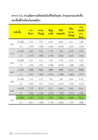 80 %u0e01%u0e32%u0e23%u0e28%u0e36%u0e01%u0e29%u0e32%u0e04%u0e48%u0e32%u0e19%u0e34%u0e22%u0e21%u0e1b%u0e23%u0e30%u0e0a%u0e32%u0e18%u0e34%u0e1b%u0e44%u0e15%u0e22%u0e43%u0e19%u0e40%u0e22%u0e32%u0e27%u0e0a%u0e19%u0e44%u0e17%u0e22%u0e15%u0e32%u0e23%u0e32%u0e07 4-2: %u0e04%u0e48%u0e32%u0e40%u0e09%u0e25%u0e35%u0e48%u0e22%u0e04%u0e27%u0e32%u0e21%u0e1e%u0e36%u0e07%u0e1e%u0e2d%u0e43%u0e08%u0e43%u0e19%u0e0a%u0e35%u0e27%u0e34%u0e15%u0e1b%u0e31%u0e08%u0e08%u0e38%u0e1a%u0e31%u0e19 %u0e08%ufffd%u0e33%u0e41%u0e19%u0e01%u0e15%u0e32%u0e21%u0e23%u0e30%u0e14%u0e31%u0e1a%u0e0a%u0e31%u0e49%u0e19 %u0e02%u0e2d%u0e07%u0e1e%u0e37%u0e49%u0e19%u0e17%u0e35%u0e48%u0e42%u0e23%u0e07%u0e40%u0e23%u0e35%u0e22%u0e19%u0e43%u0e19%u0e40%u0e02%u0e15%u0e40%u0e21%u0e37%u0e2d%u0e07%u0e23%u0e30%u0e14%u0e31%u0e1a%u0e0a%u0e31%u0e49%u0e19 %u0e01%u0e32%u0e23%u0e28%u0e36%u0e01%u0e29%u0e32%u0e04%u0e27%u0e32%u0e21%u0e40%u0e1b%u0e47%u0e19%u0e2d%u0e22%u0e39%u0e48%u0e17%u0e35%u0e48%u0e2d%u0e22%u0e39%u0e48%u0e2d%u0e32%u0e28%u0e31%u0e22%u0e0a%u0e35%u0e27%u0e34%u0e15%u0e04%u0e23%u0e2d%u0e1a%u0e04%u0e23%u0e31%u0e27%u0e0a%u0e35%u0e27%u0e34%u0e15%u0e04%u0e27%u0e32%u0e21%u0e40%u0e1b%u0e47%u0e19%u0e2d%u0e22%u0e39%u0e48%u0e01%u0e32%u0e23%u0e22%u0e2d%u0e21%u0e23%u0e31%u0e1a%u0e17%u0e32%u0e07%u0e2a%u0e31%u0e07%u0e04%u0e21%u0e21.1%u0e04%u0e48%u0e32%u0e40%u0e09%u0e25%u0e35%u0e48%u0e22 7.53 7.97 8.10 8.02 8.11 7.88S.D 1.879 1.658 1.643 2.236 1.937 1.953%u0e21.2%u0e04%u0e48%u0e32%u0e40%u0e09%u0e25%u0e35%u0e48%u0e22 7.26 7.47 7.79 7.95 8.18 7.95S.D 1.773 1.949 1.793 2.055 2.021 1.916%u0e21.3%u0e04%u0e48%u0e32%u0e40%u0e09%u0e25%u0e35%u0e48%u0e22 7.42 7.61 7.82 7.78 8.19 7.83S.D 1.875 1.911 1.928 2.032 1.680 1.985%u0e21.4%u0e04%u0e48%u0e32%u0e40%u0e09%u0e25%u0e35%u0e48%u0e22 7.25 7.61 7.81 7.87 8.31 7.92S.D 1.797 1.903 1.937 1.982 1.863 1.971%u0e21.5%u0e04%u0e48%u0e32%u0e40%u0e09%u0e25%u0e35%u0e48%u0e22 7.53 7.57 7.81 7.93 8.22 8.35S.D 1.820 1.911 1.833 2.012 1.705 1.675%u0e21.6%u0e04%u0e48%u0e32%u0e40%u0e09%u0e25%u0e35%u0e48%u0e22 7.73 8.12 8.17 8.45 8.45 8.45S.D 1.706 1.555 1.475 1.592 1.473 1.446%u0e23%u0e27%u0e21%u0e04%u0e48%u0e32%u0e40%u0e09%u0e25%u0e35%u0e48%u0e22 7.45 7.72 7.91 8.00 8.24 8.06S.D 1.811 1.830 1.778 2.000 1.787 1.846