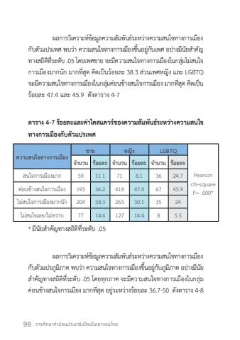 98 %u0e01%u0e32%u0e23%u0e28%u0e36%u0e01%u0e29%u0e32%u0e04%u0e48%u0e32%u0e19%u0e34%u0e22%u0e21%u0e1b%u0e23%u0e30%u0e0a%u0e32%u0e18%u0e34%u0e1b%u0e44%u0e15%u0e22%u0e43%u0e19%u0e40%u0e22%u0e32%u0e27%u0e0a%u0e19%u0e44%u0e17%u0e22%u0e1c%u0e25%u0e01%u0e32%u0e23%u0e27%u0e34%u0e40%u0e04%u0e23%u0e32%u0e30%u0e2b%u0e4c%u0e02%u0e49%u0e2d%u0e21%u0e39%u0e25%u0e04%u0e27%u0e32%u0e21%u0e2a%u0e31%u0e21%u0e1e%u0e31%u0e19%u0e18%u0e4c%u0e23%u0e30%u0e2b%u0e27%u0e48%u0e32%u0e07%u0e04%u0e27%u0e32%u0e21%u0e2a%u0e19%u0e43%u0e08%u0e17%u0e32%u0e07%u0e01%u0e32%u0e23%u0e40%u0e21%u0e37%u0e2d%u0e07%u0e01%u0e31%u0e1a%u0e15%u0e31%u0e27%u0e41%u0e1b%u0e23%u0e40%u0e1e%u0e28 %u0e1e%u0e1a%u0e27%u0e48%u0e32 %u0e04%u0e27%u0e32%u0e21%u0e2a%u0e19%u0e43%u0e08%u0e17%u0e32%u0e07%u0e01%u0e32%u0e23%u0e40%u0e21%u0e37%u0e2d%u0e07%u0e02%u0e36%u0e49%u0e19%u0e2d%u0e22%u0e39%u0e48%u0e01%u0e31%u0e1a%u0e40%u0e1e%u0e28 %u0e2d%u0e22%u0e48%u0e32%u0e07%u0e21%u0e35%u0e19%u0e31%u0e22%u0e2a%ufffd%u0e33%u0e04%u0e31%u0e0d%u0e17%u0e32%u0e07%u0e2a%u0e16%u0e34%u0e15%u0e34%u0e17%u0e35%u0e48%u0e23%u0e30%u0e14%u0e31%u0e1a .05 %u0e42%u0e14%u0e22%u0e40%u0e1e%u0e28%u0e0a%u0e32%u0e22 %u0e08%u0e30%u0e21%u0e35%u0e04%u0e27%u0e32%u0e21%u0e2a%u0e19%u0e43%u0e08%u0e17%u0e32%u0e07%u0e01%u0e32%u0e23%u0e40%u0e21%u0e37%u0e2d%u0e07%u0e43%u0e19%u0e01%u0e25%u0e38%u0e48%u0e21%u0e44%u0e21%u0e48%u0e2a%u0e19%u0e43%u0e08%u0e01%u0e32%u0e23%u0e40%u0e21%u0e37%u0e2d%u0e07%u0e21%u0e32%u0e01%u0e19%u0e31%u0e01 %u0e21%u0e32%u0e01%u0e17%u0e35%u0e48%u0e2a%u0e38%u0e14 %u0e04%u0e34%u0e14%u0e40%u0e1b%u0e47%u0e19%u0e23%u0e49%u0e2d%u0e22%u0e25%u0e30 38.3 %u0e2a%u0e48%u0e27%u0e19%u0e40%u0e1e%u0e28%u0e2b%u0e0d%u0e34%u0e07 %u0e41%u0e25%u0e30 LGBTQ %u0e08%u0e30%u0e21%u0e35%u0e04%u0e27%u0e32%u0e21%u0e2a%u0e19%u0e43%u0e08%u0e17%u0e32%u0e07%u0e01%u0e32%u0e23%u0e40%u0e21%u0e37%u0e2d%u0e07%u0e43%u0e19%u0e01%u0e25%u0e38%u0e48%u0e21%u0e04%u0e48%u0e2d%u0e19%u0e02%u0e49%u0e32%u0e07%u0e2a%u0e19%u0e43%u0e08%u0e01%u0e32%u0e23%u0e40%u0e21%u0e37%u0e2d%u0e07 %u0e21%u0e32%u0e01%u0e17%u0e35%u0e48%u0e2a%u0e38%u0e14 %u0e04%u0e34%u0e14%u0e40%u0e1b%u0e47%u0e19%u0e23%u0e49%u0e2d%u0e22%u0e25%u0e30 47.4 %u0e41%u0e25%u0e30 45.9 %u0e14%u0e31%u0e07%u0e15%u0e32%u0e23%u0e32%u0e07 4-7%u0e15%u0e32%u0e23%u0e32%u0e07 4-7 %u0e23%u0e49%u0e2d%u0e22%u0e25%u0e30%u0e41%u0e25%u0e30%u0e04%u0e48%u0e32%u0e44%u0e04%u0e2a%u0e41%u0e04%u0e27%u0e23%u0e4c%u0e02%u0e2d%u0e07%u0e04%u0e27%u0e32%u0e21%u0e2a%u0e31%u0e21%u0e1e%u0e31%u0e19%u0e18%u0e4c%u0e23%u0e30%u0e2b%u0e27%u0e48%u0e32%u0e07%u0e04%u0e27%u0e32%u0e21%u0e2a%u0e19%u0e43%u0e08%u0e17%u0e32%u0e07%u0e01%u0e32%u0e23%u0e40%u0e21%u0e37%u0e2d%u0e07%u0e01%u0e31%u0e1a%u0e15%u0e31%u0e27%u0e41%u0e1b%u0e23%u0e40%u0e1e%u0e28 %u0e04%u0e27%u0e32%u0e21%u0e2a%u0e19%u0e43%u0e08%u0e17%u0e32%u0e07%u0e01%u0e32%u0e23%u0e40%u0e21%u0e37%u0e2d%u0e07%u0e0a%u0e32%u0e22 %u0e2b%u0e0d%u0e34%u0e07 LGBTQPearson chi-squareP= .000*%u0e08%ufffd%u0e33%u0e19%u0e27%u0e19 %u0e23%u0e49%u0e2d%u0e22%u0e25%u0e30 %u0e08%ufffd%u0e33%u0e19%u0e27%u0e19 %u0e23%u0e49%u0e2d%u0e22%u0e25%u0e30 %u0e08%ufffd%u0e33%u0e19%u0e27%u0e19 %u0e23%u0e49%u0e2d%u0e22%u0e25%u0e30%u0e2a%u0e19%u0e43%u0e08%u0e01%u0e32%u0e23%u0e40%u0e21%u0e37%u0e2d%u0e07%u0e21%u0e32%u0e01 59 11.1 71 8.1 36 24.7%u0e04%u0e48%u0e2d%u0e19%u0e02%u0e49%u0e32%u0e07%u0e2a%u0e19%u0e43%u0e08%u0e01%u0e32%u0e23%u0e40%u0e21%u0e37%u0e2d%u0e07 193 36.2 418 47.4 67 45.9%u0e44%u0e21%u0e48%u0e2a%u0e19%u0e43%u0e08%u0e01%u0e32%u0e23%u0e40%u0e21%u0e37%u0e2d%u0e07%u0e21%u0e32%u0e01%u0e19%u0e31%u0e01 204 38.3 265 30.1 35 24%u0e44%u0e21%u0e48%u0e2a%u0e19%u0e43%u0e08%u0e40%u0e25%u0e22/%u0e44%u0e21%u0e48%u0e17%u0e23%u0e32%u0e1a 77 14.4 127 14.4 8 5.5* %u0e21%u0e35%u0e19%u0e31%u0e22%u0e2a%ufffd%u0e33%u0e04%u0e31%u0e0d%u0e17%u0e32%u0e07%u0e2a%u0e16%u0e34%u0e15%u0e34%u0e17%u0e35%u0e48%u0e23%u0e30%u0e14%u0e31%u0e1a .05%u0e1c%u0e25%u0e01%u0e32%u0e23%u0e27%u0e34%u0e40%u0e04%u0e23%u0e32%u0e30%u0e2b%u0e4c%u0e02%u0e49%u0e2d%u0e21%u0e39%u0e25%u0e04%u0e27%u0e32%u0e21%u0e2a%u0e31%u0e21%u0e1e%u0e31%u0e19%u0e18%u0e4c%u0e23%u0e30%u0e2b%u0e27%u0e48%u0e32%u0e07%u0e04%u0e27%u0e32%u0e21%u0e2a%u0e19%u0e43%u0e08%u0e17%u0e32%u0e07%u0e01%u0e32%u0e23%u0e40%u0e21%u0e37%u0e2d%u0e07%u0e01%u0e31%u0e1a%u0e15%u0e31%u0e27%u0e41%u0e1b%u0e23%u0e20%u0e39%u0e21%u0e34%u0e20%u0e32%u0e04 %u0e1e%u0e1a%u0e27%u0e48%u0e32 %u0e04%u0e27%u0e32%u0e21%u0e2a%u0e19%u0e43%u0e08%u0e17%u0e32%u0e07%u0e01%u0e32%u0e23%u0e40%u0e21%u0e37%u0e2d%u0e07%u0e02%u0e36%u0e49%u0e19%u0e2d%u0e22%u0e39%u0e48%u0e01%u0e31%u0e1a%u0e20%u0e39%u0e21%u0e34%u0e20%u0e32%u0e04 %u0e2d%u0e22%u0e48%u0e32%u0e07%u0e21%u0e35%u0e19%u0e31%u0e22%u0e2a%ufffd%u0e33%u0e04%u0e31%u0e0d%u0e17%u0e32%u0e07%u0e2a%u0e16%u0e34%u0e15%u0e34%u0e17%u0e35%u0e48%u0e23%u0e30%u0e14%u0e31%u0e1a .05 %u0e42%u0e14%u0e22%u0e17%u0e38%u0e01%u0e20%u0e32%u0e04 %u0e08%u0e30%u0e21%u0e35%u0e04%u0e27%u0e32%u0e21%u0e2a%u0e19%u0e43%u0e08%u0e17%u0e32%u0e07%u0e01%u0e32%u0e23%u0e40%u0e21%u0e37%u0e2d%u0e07%u0e43%u0e19%u0e01%u0e25%u0e38%u0e48%u0e21%u0e04%u0e48%u0e2d%u0e19%u0e02%u0e49%u0e32%u0e07%u0e2a%u0e19%u0e43%u0e08%u0e01%u0e32%u0e23%u0e40%u0e21%u0e37%u0e2d%u0e07 %u0e21%u0e32%u0e01%u0e17%u0e35%u0e48%u0e2a%u0e38%u0e14 %u0e2d%u0e22%u0e39%u0e48%u0e23%u0e30%u0e2b%u0e27%u0e48%u0e32%u0e07%u0e23%u0e49%u0e2d%u0e22%u0e25%u0e30 36.7-50 %u0e14%u0e31%u0e07%u0e15%u0e32%u0e23%u0e32%u0e07 4-8